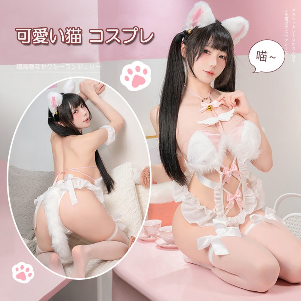 SENMHS セクシー 猫 コスプレ童貞殺しスク水 ロリータ ランジェリー レオタード オープンクロッチ ハイレグ コスチューム 団子少女風 レディース ホワイト ワンサイズ イベント用 アームリング2個付き 尻尾付き ストッキング6186