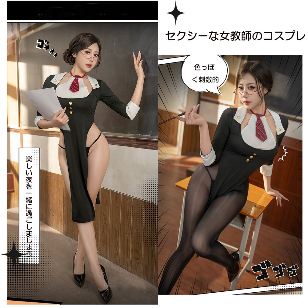 SENMHS セクシーな女教師コスプレドレス フリーサイズ ブラック & レッド柄ネクタイ付き ハロウィン コスプレ 衣装 レディース セクシーコスチューム 事務員 お姉さん 夢のような魅力 フリーサイズ6190