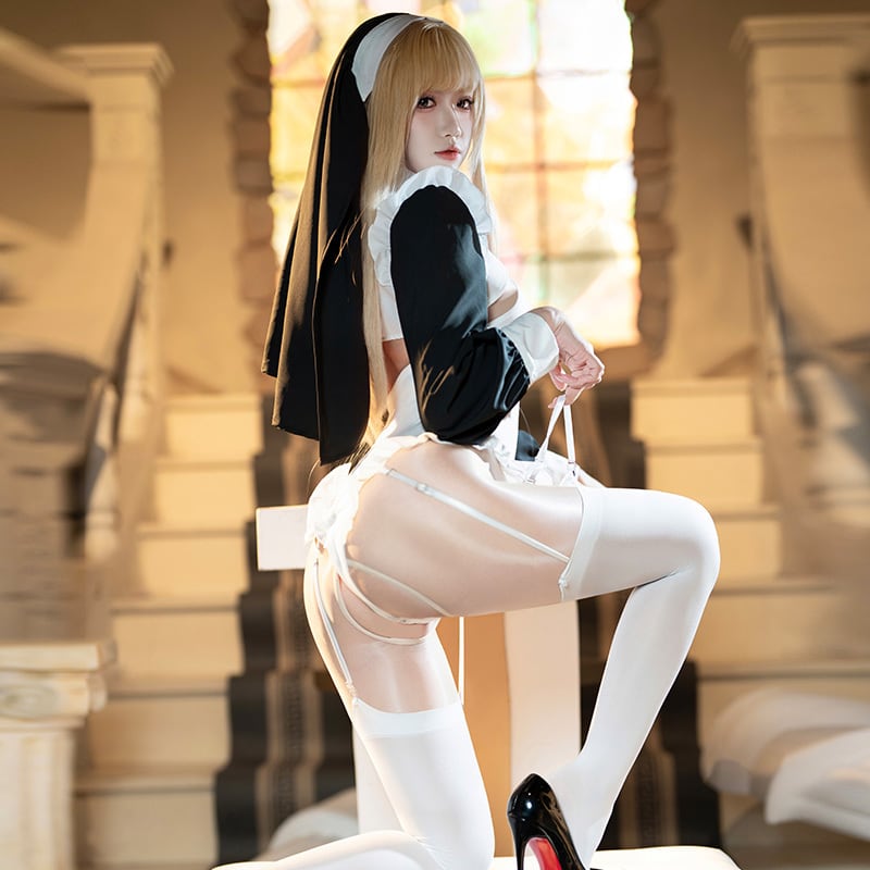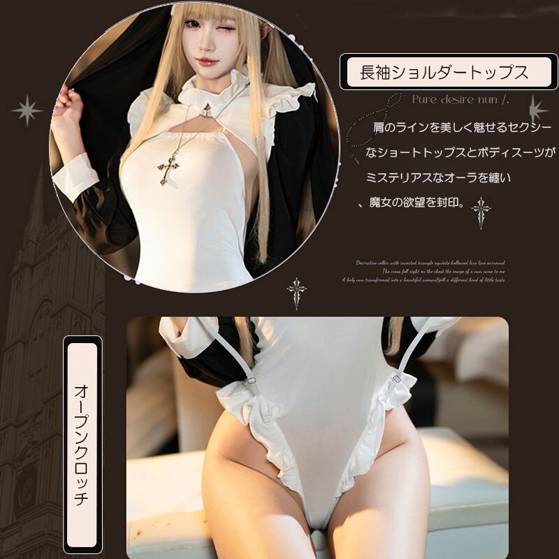 SENMHS セクシーシスター コスプレ衣装セット 黒 オープンクロッチボディスーツ+トップス+ベール+十字架+ストッキング付き 聖女・牧師風ランジェリー ハロウィン仮装 コスチューム ワンサイズ レディースzy09