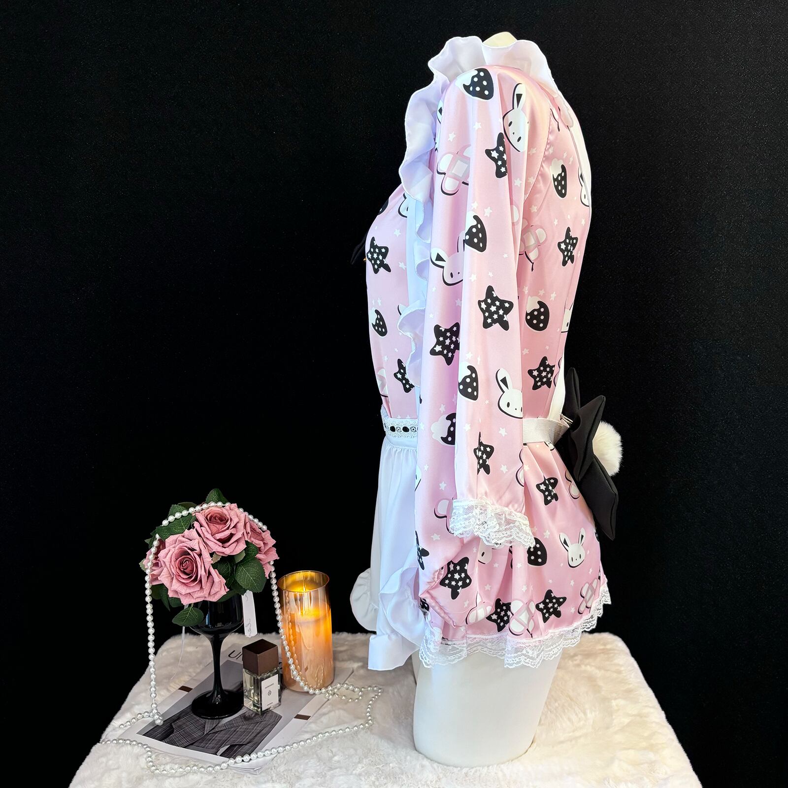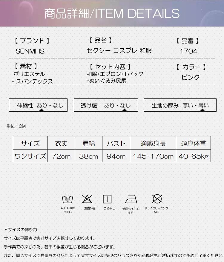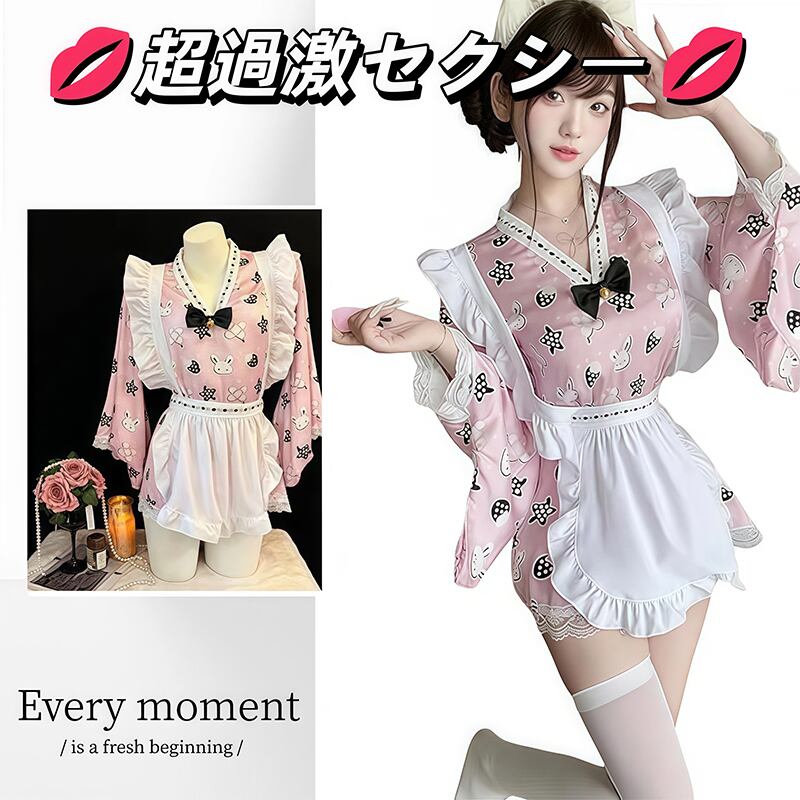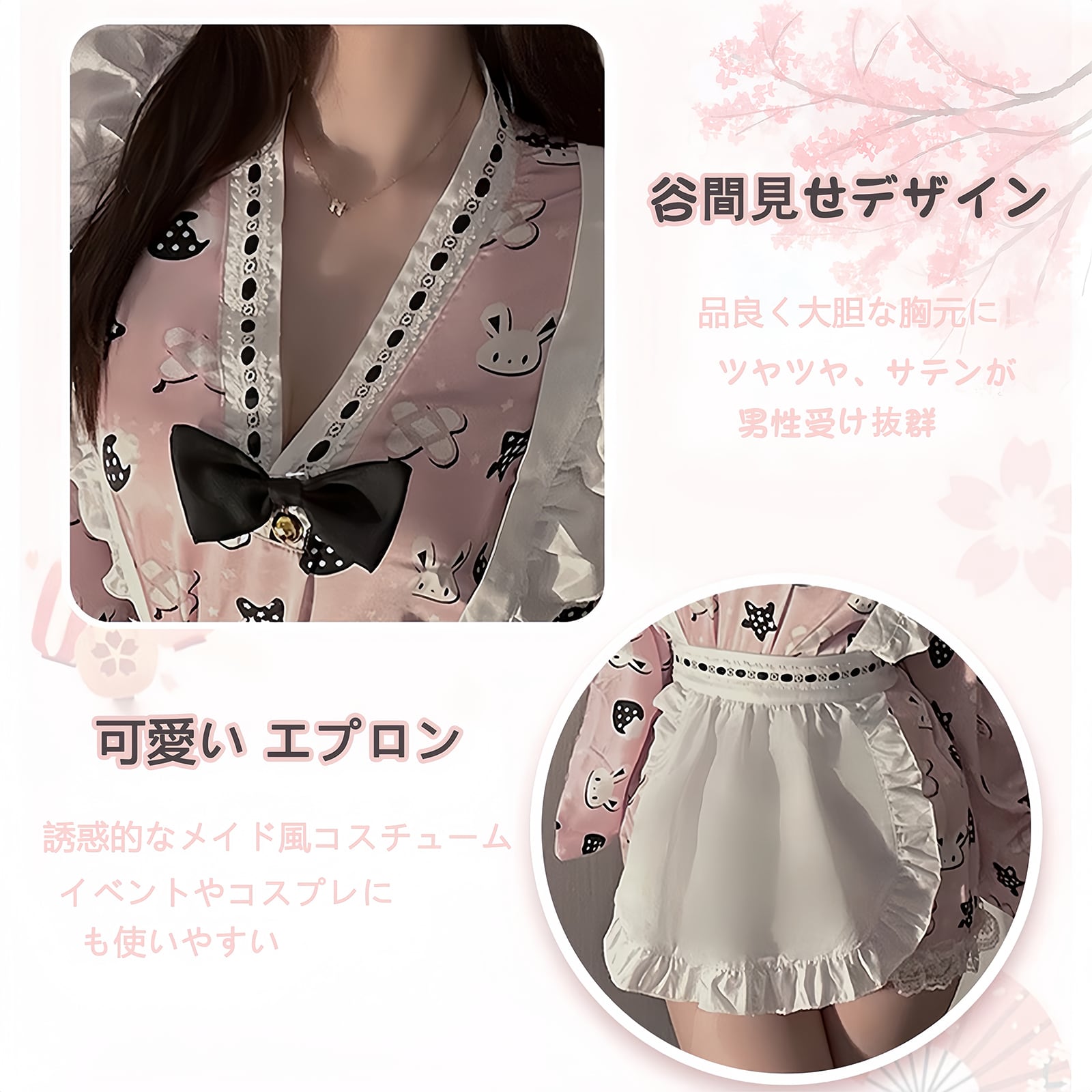 SENMHS和風セクシーコスチューム(浴衣+エプロン+Tバック+うさぎ尻尾)4点セット 花魁 ベビドール風 ピンクウサギ柄 前開きデザイン フリーサイズ 撮影用 大人ランジェリー レディース 仮装 和装 コスプレ1704