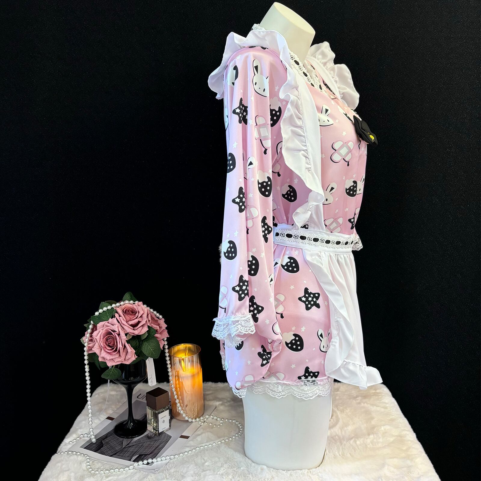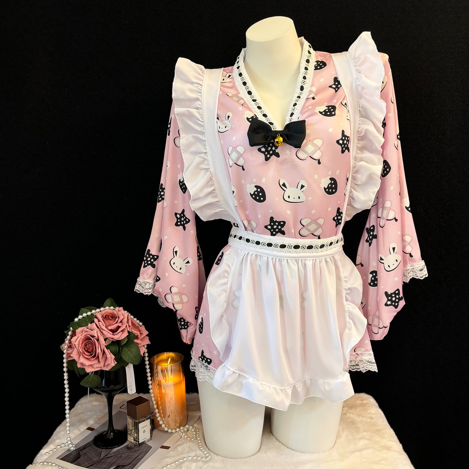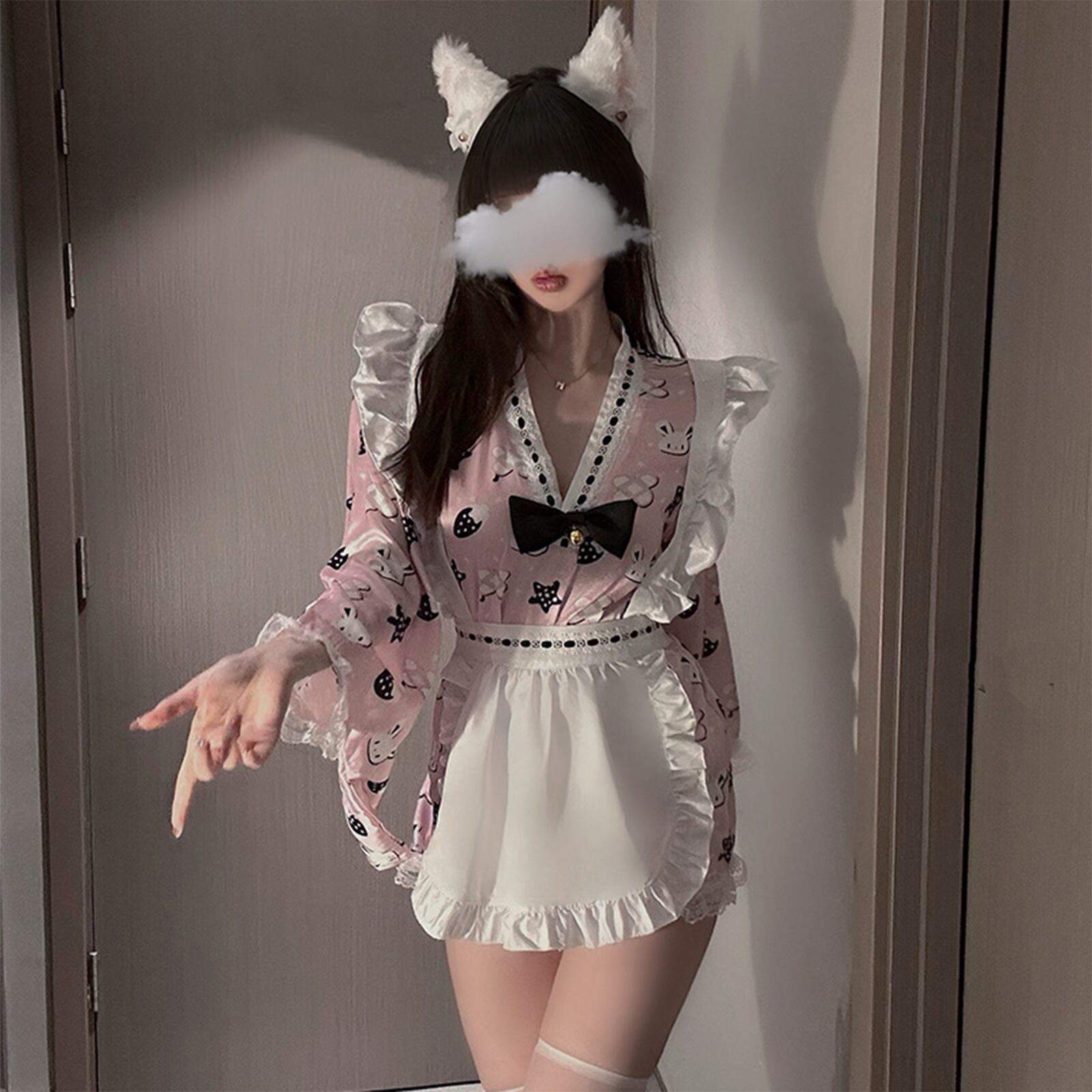 SENMHS和風セクシーコスチューム(浴衣+エプロン+Tバック+うさぎ尻尾)4点セット 花魁 ベビドール風 ピンクウサギ柄 前開きデザイン フリーサイズ 撮影用 大人ランジェリー レディース 仮装 和装 コスプレ1704