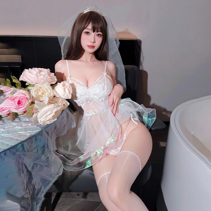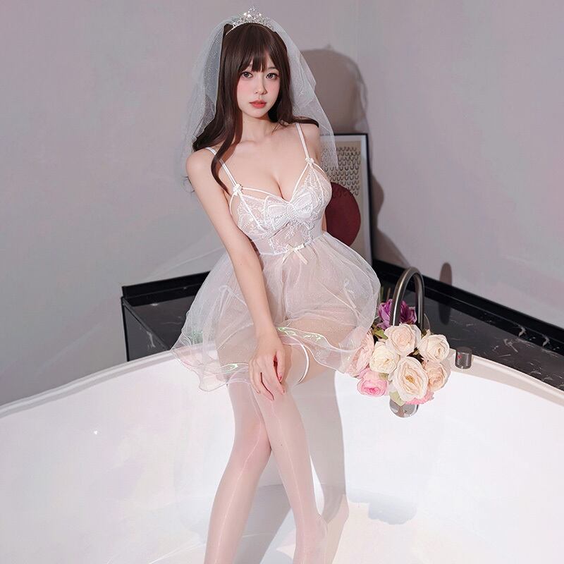 SENMHS ウェディングドレス 花嫁 (ワンピース+ベール)コスプレ セクシー コスチューム ランジェリー ベビードール レオタード インナーウエディング 可愛い レディース ホワイト6603