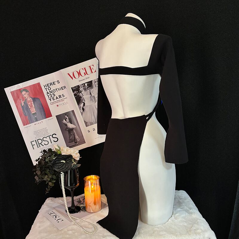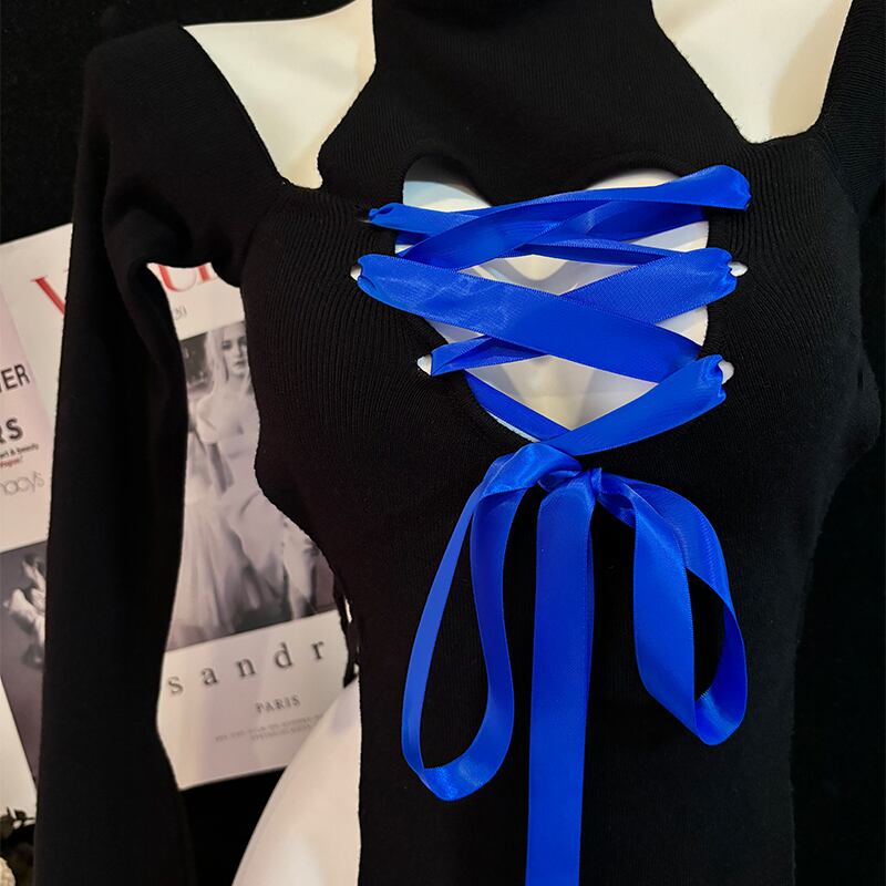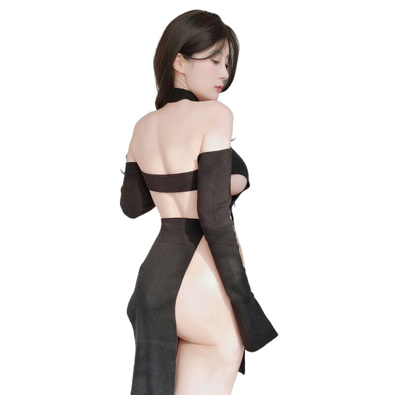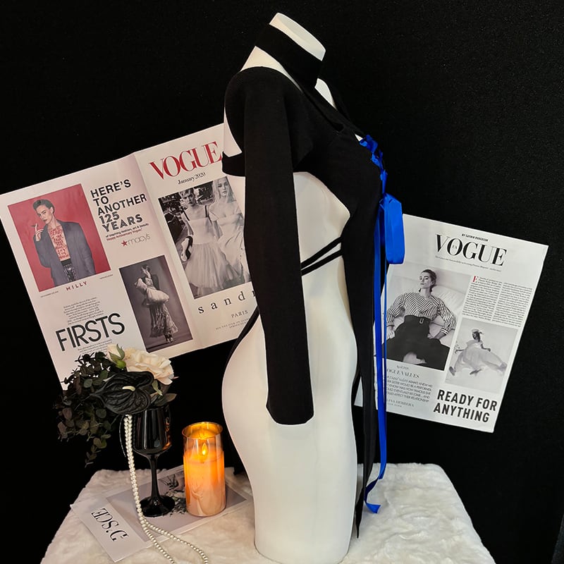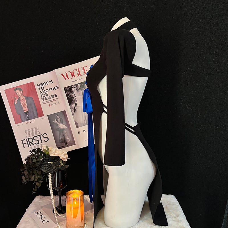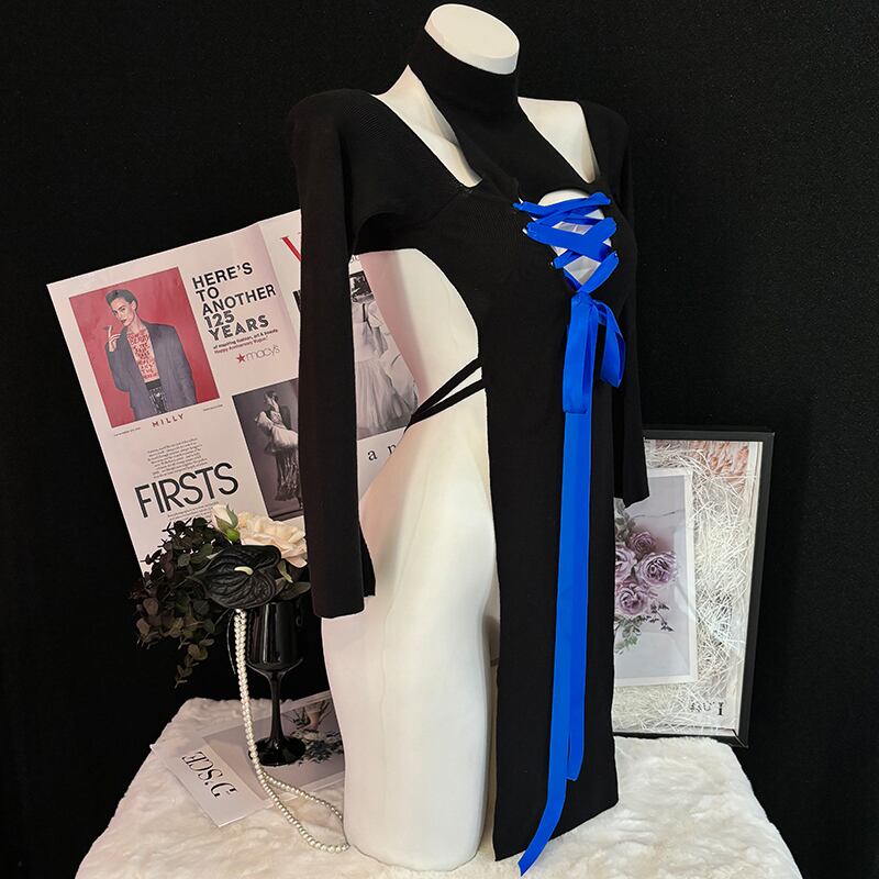 SENMHSリブ編み ニット オールインワン ブラック 胸元開き セクシー可愛い コスプレ ロリータ風 大きなリボン付き ヒップ丈 レディース 大人用 ランジェリーsq377