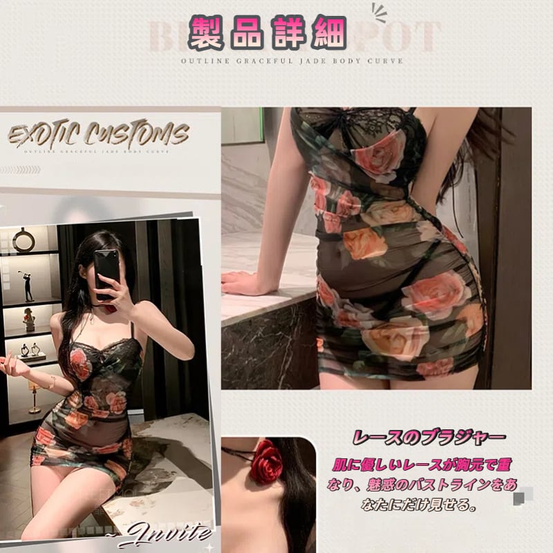 SENMHSセクシー ローズ柄 キャミソール風 コスプレ 2点セット(ドレス+Tバック) ホルターネック 背中あき シースルー ナイトクラブ風 ハロウィン 仮装 パーティー 撮影会 衣装 ブラック レディース フリーサイズzy75