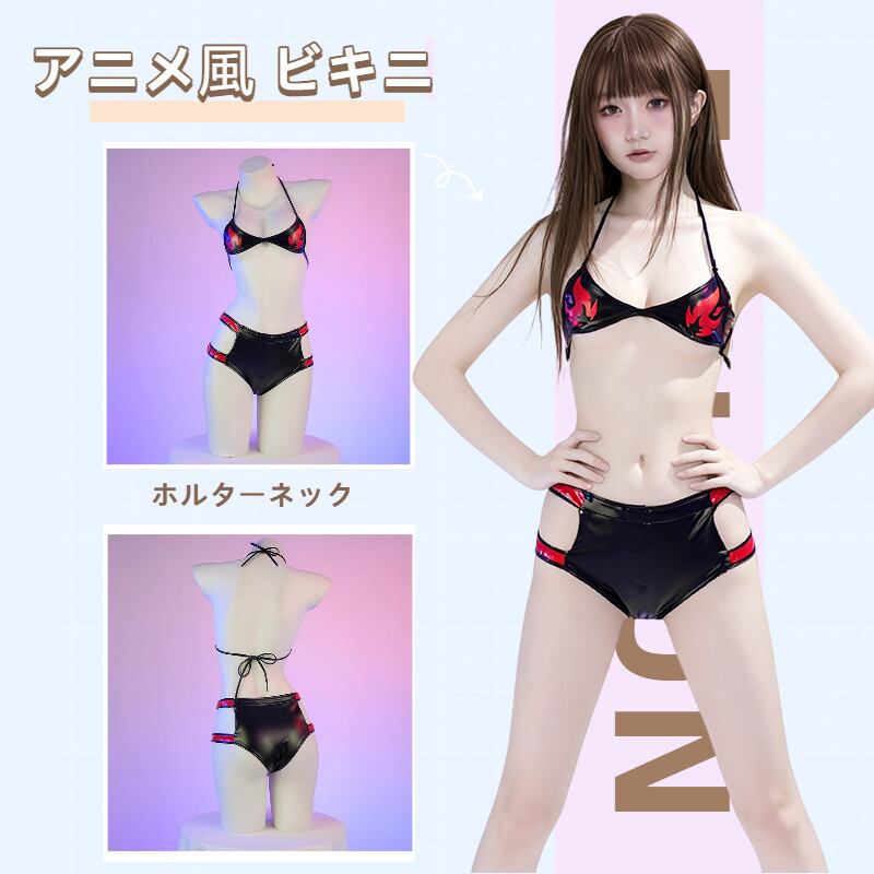【即納】SENMHS アニメ風 火影プリント セクシービキニ コスプレランジェリー ミニブラ 分離式三点セット 撮影会用 可愛いセクシー レディース フリーサイズ ブラックc2063