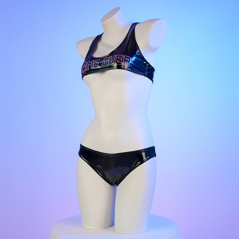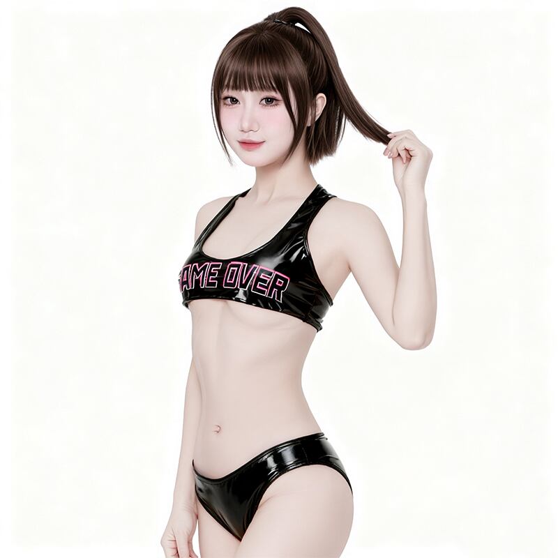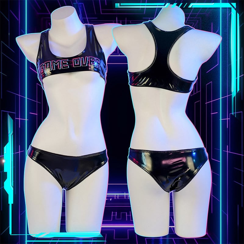SENMHS ゲーム GAME OVER プリント セクシーアニメ風 ビキニコスプレ 亮面PVCレザー ミニブラ 分体式セット 撮影会用 可愛い競技レオタード風 レディース ワンサイズ ブラックc2093