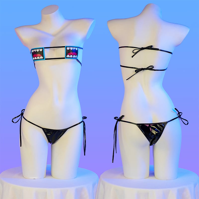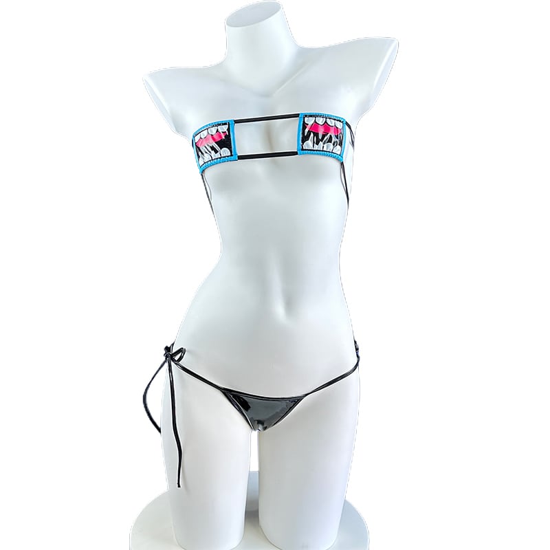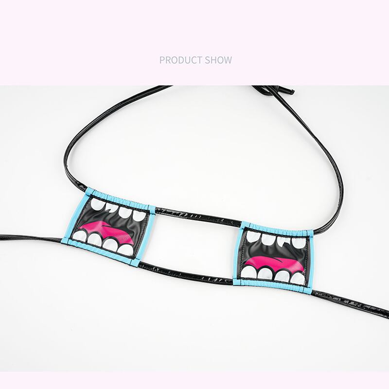 SENMHS セクシー口元プリント ビキニ コスプレ ランジェリー 光沢PUレザー ミニブラ セパレートセット 撮影会用 フリーサイズ レディース ブラックc2095