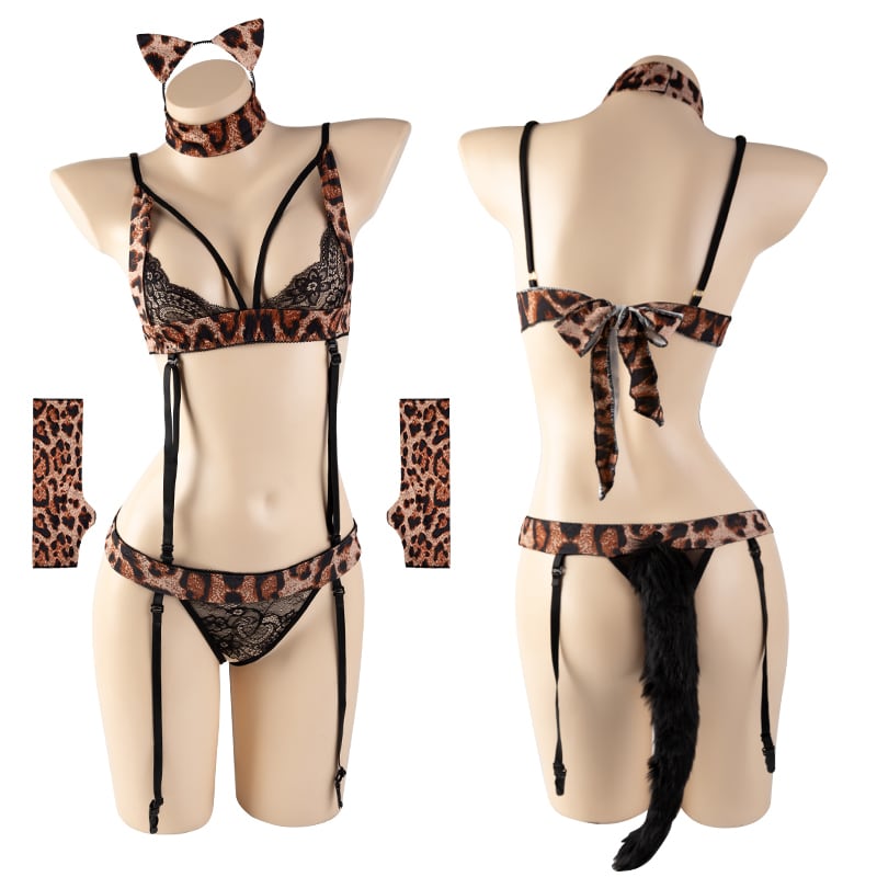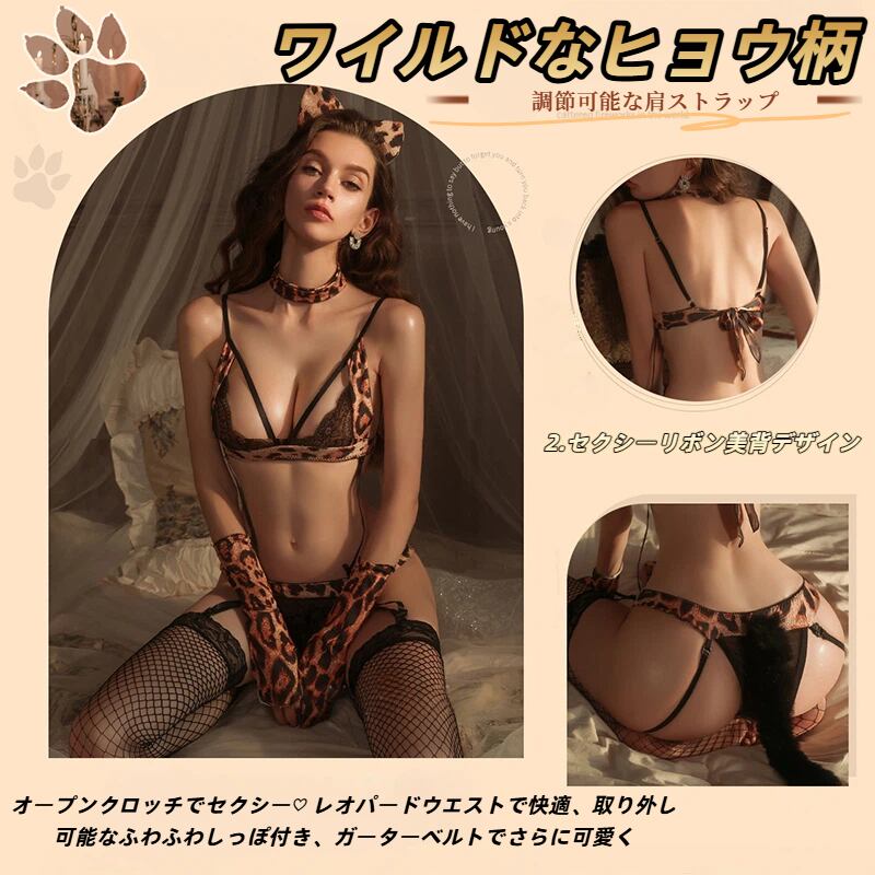 SENMHS セクシー 猫コスプレ ランジェリー7点セット(カチューシャ+チョーカー+ブラ+Tバック+袖×2+ぬいぐるみ尻尾+ガーター×4)レオパード柄 かわいい キャット コスチューム レディース ハロウィン クリスマス 仮装 イベント用100632