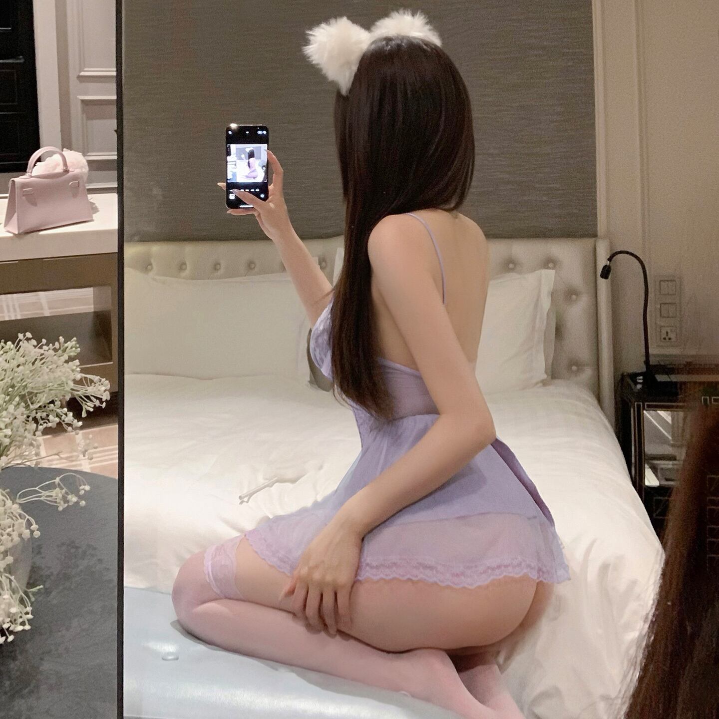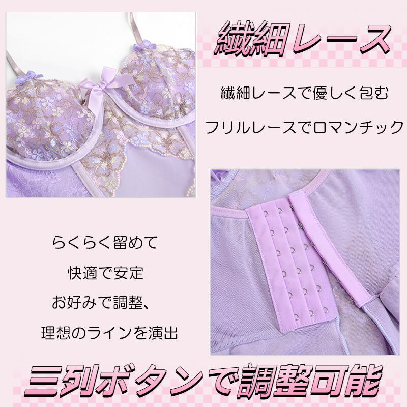SENMHS セクシー コルセット ランジェリー 透けレース 2点セット(トップス+Tバック) 背中あき デザイン 勝負下着 キャミソール風 エレガント 大人可愛い レディース パープル7713
