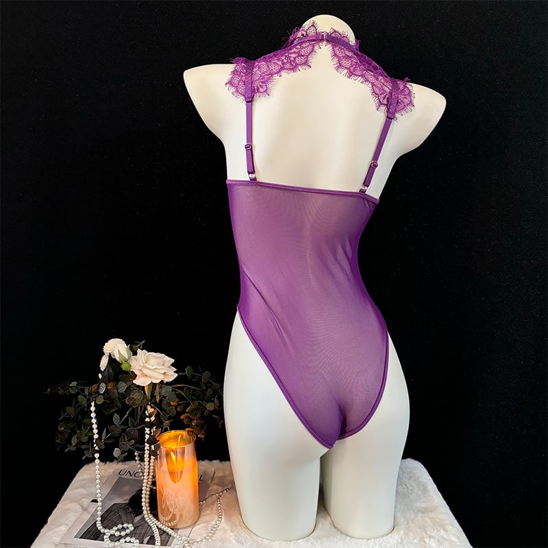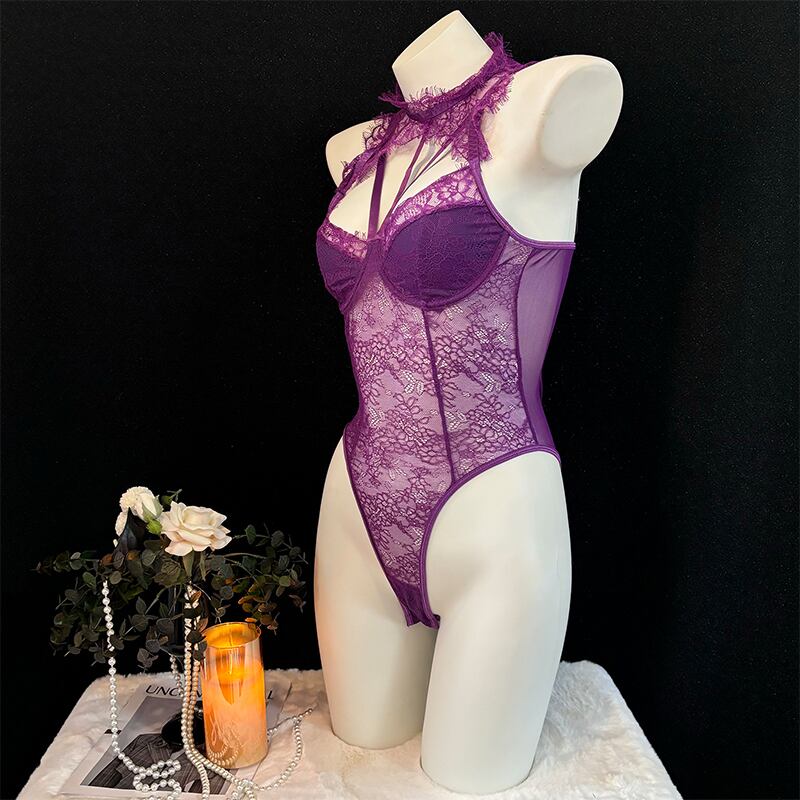 SENMHSセクシーランジェリー 透け感レースボディスーツ 寝室用&コスプレ兼用 オープンカップデザイン 修身シルエット パープル レディース S-M-Lサイズ3382