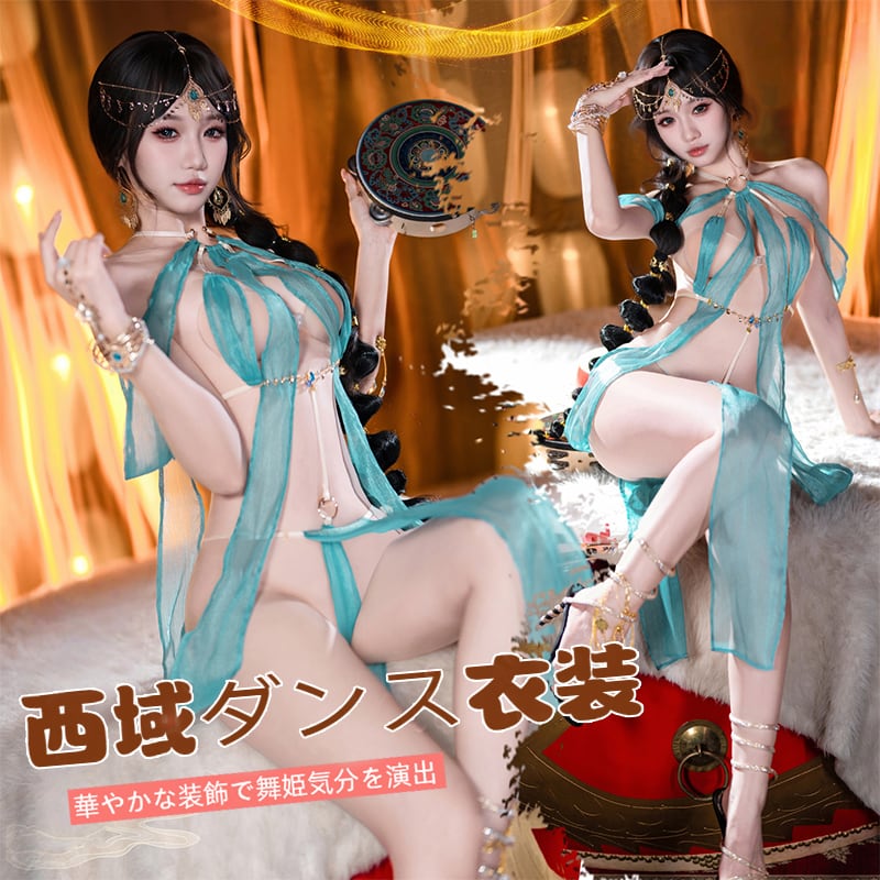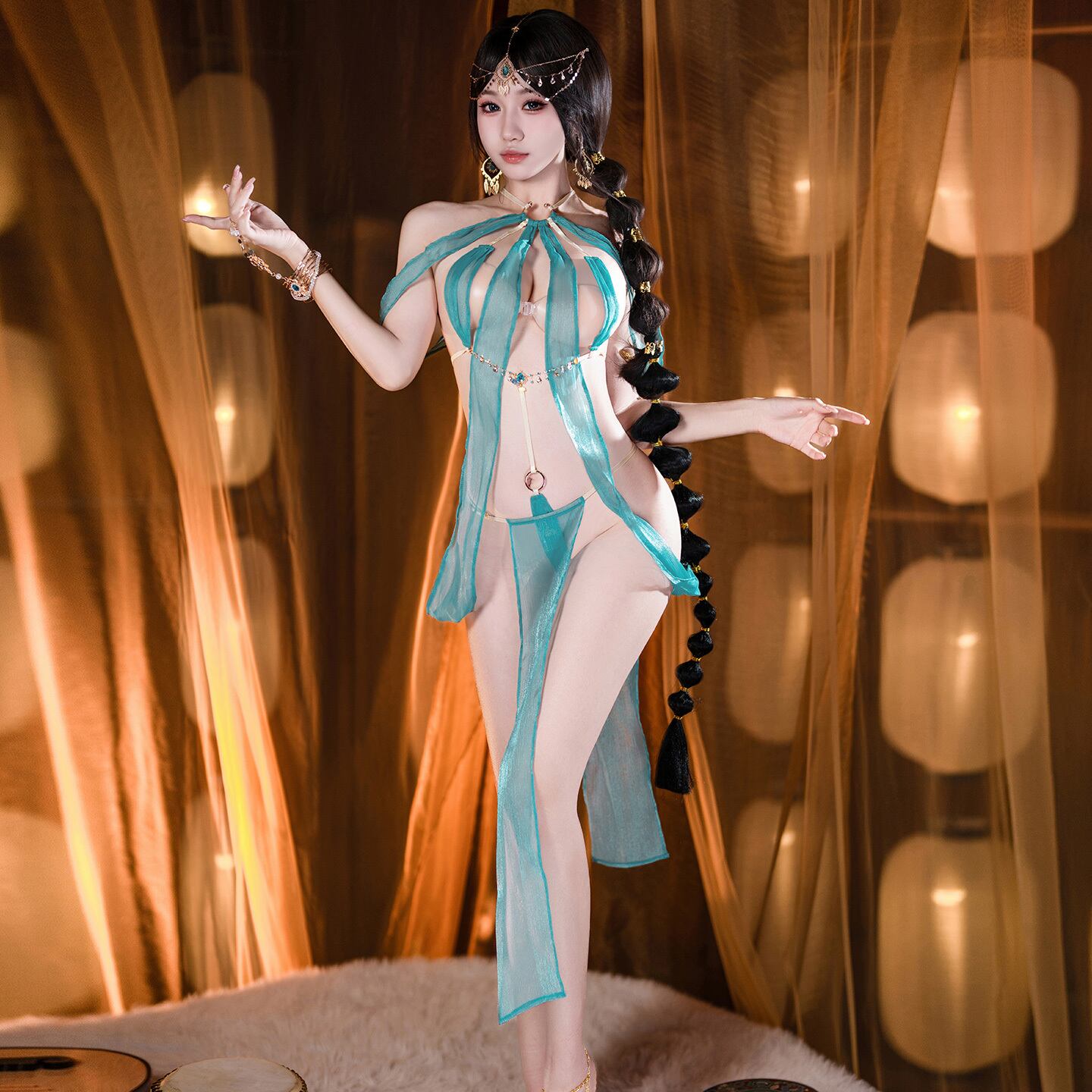 SENMHS セクシー エスニック風コスプレ ランジェリー 2点セット(レオタード+ミニスカート)透け感デザイン 舞台衣装 レディース デート・イベント・撮影会にぴったり グリーンzy41