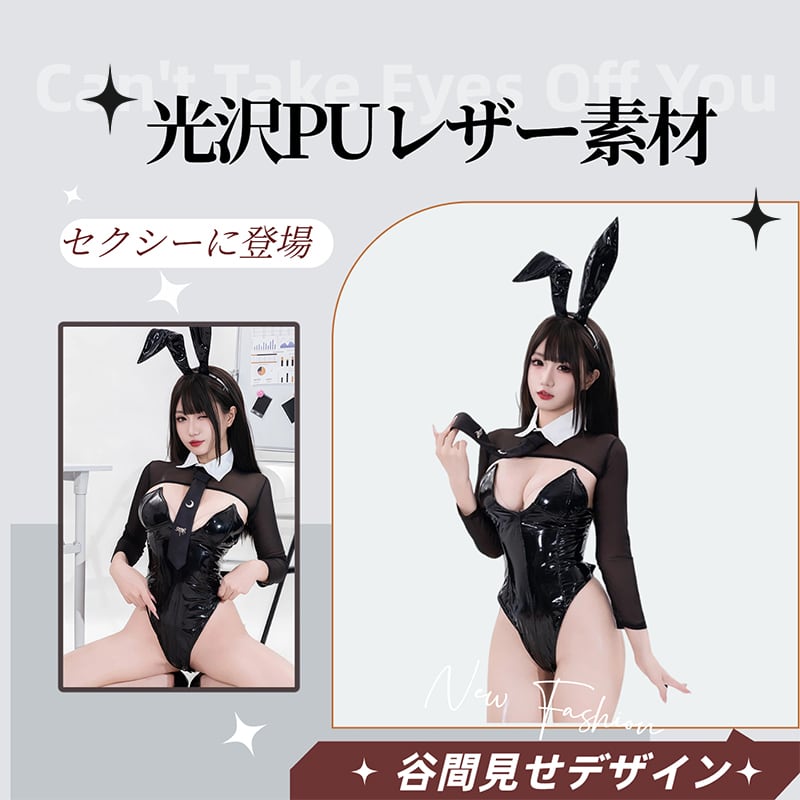 SENMHS シースルー バニーガール コスプレ セット セクシー 誘惑系 ハイレグ 小悪魔風 レオタード PUボディスーツ うさ耳カチューシャ 網タイツ付き 撮影会 仮装 ハロウィン レディース コスチューム ブラック4066