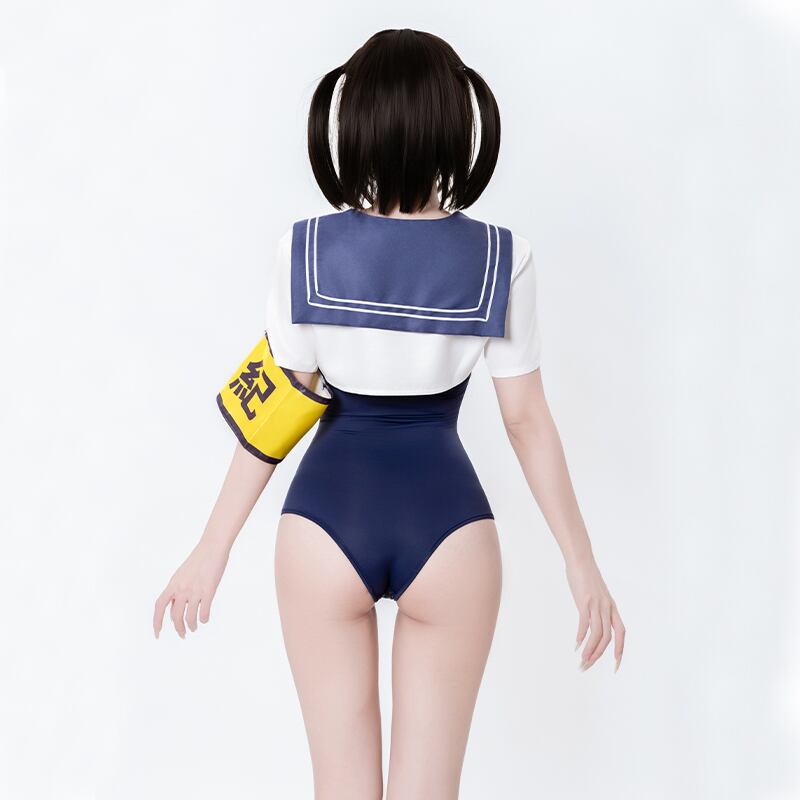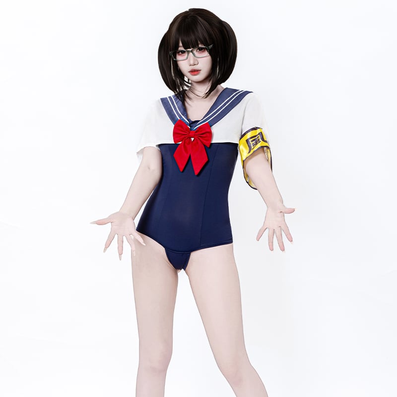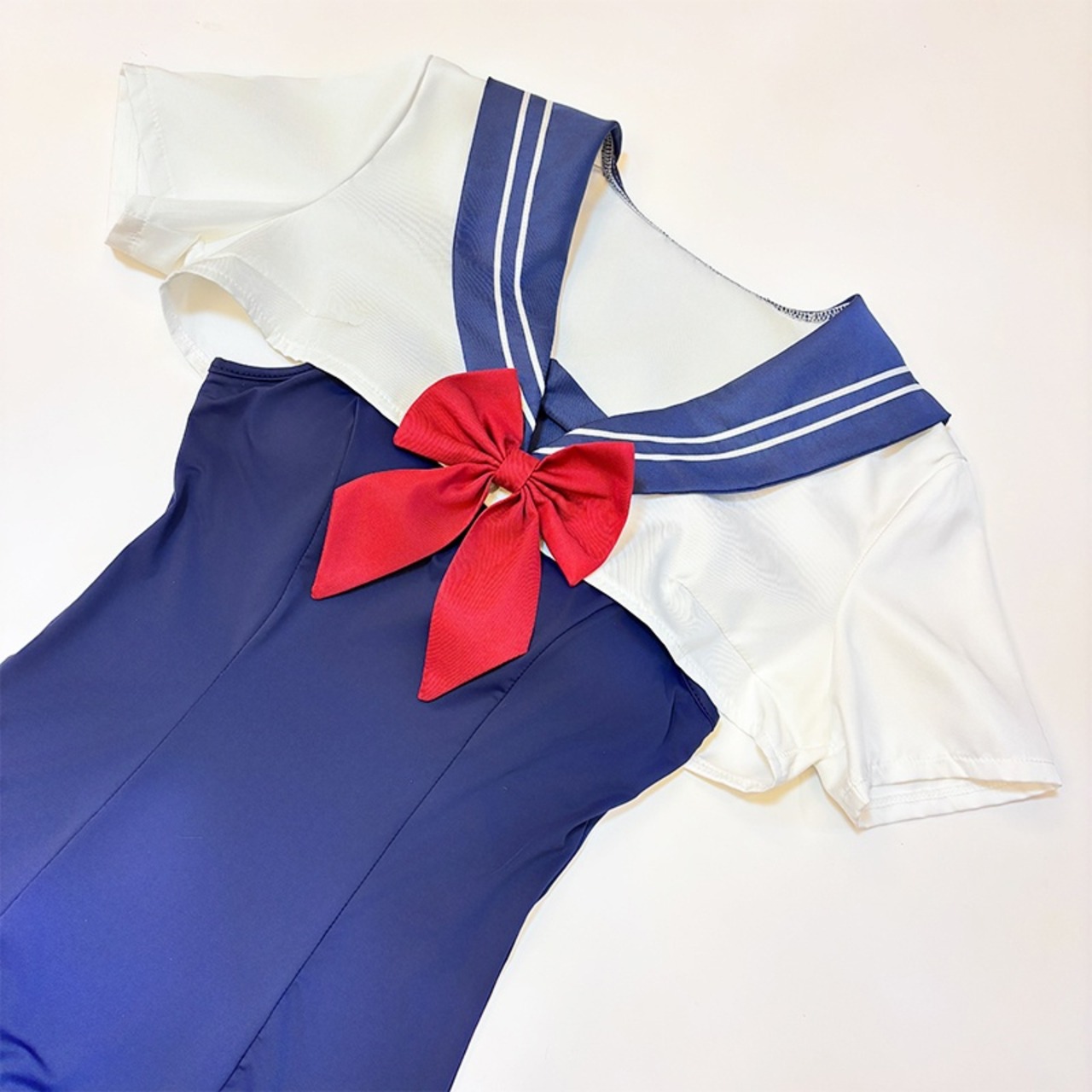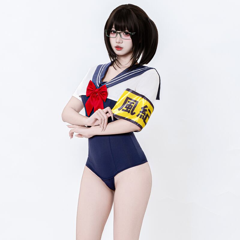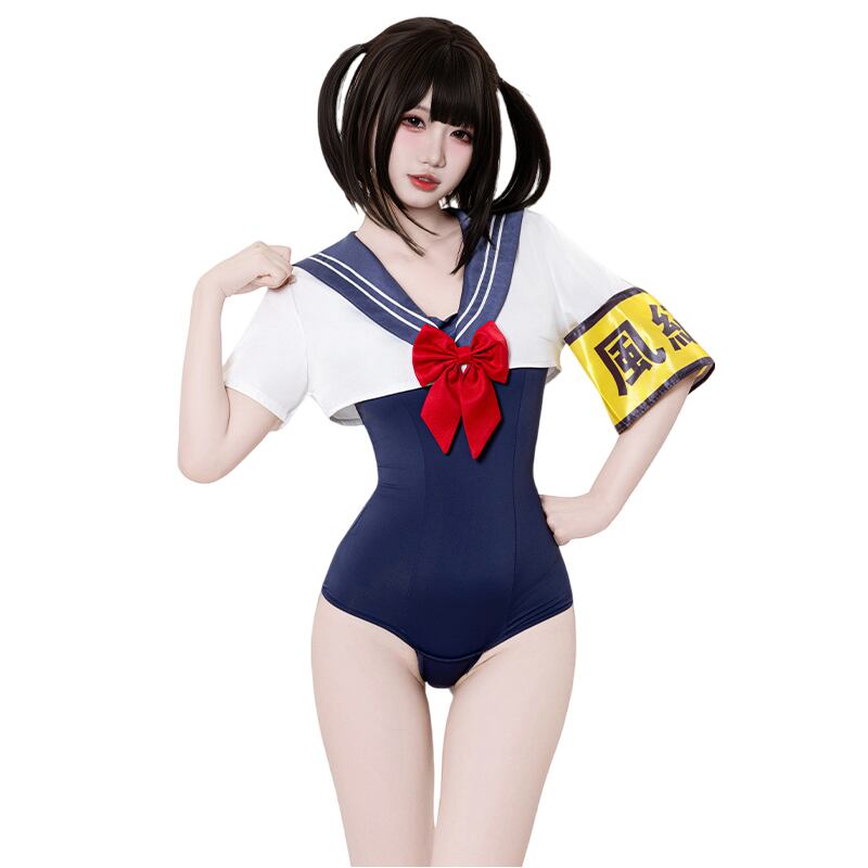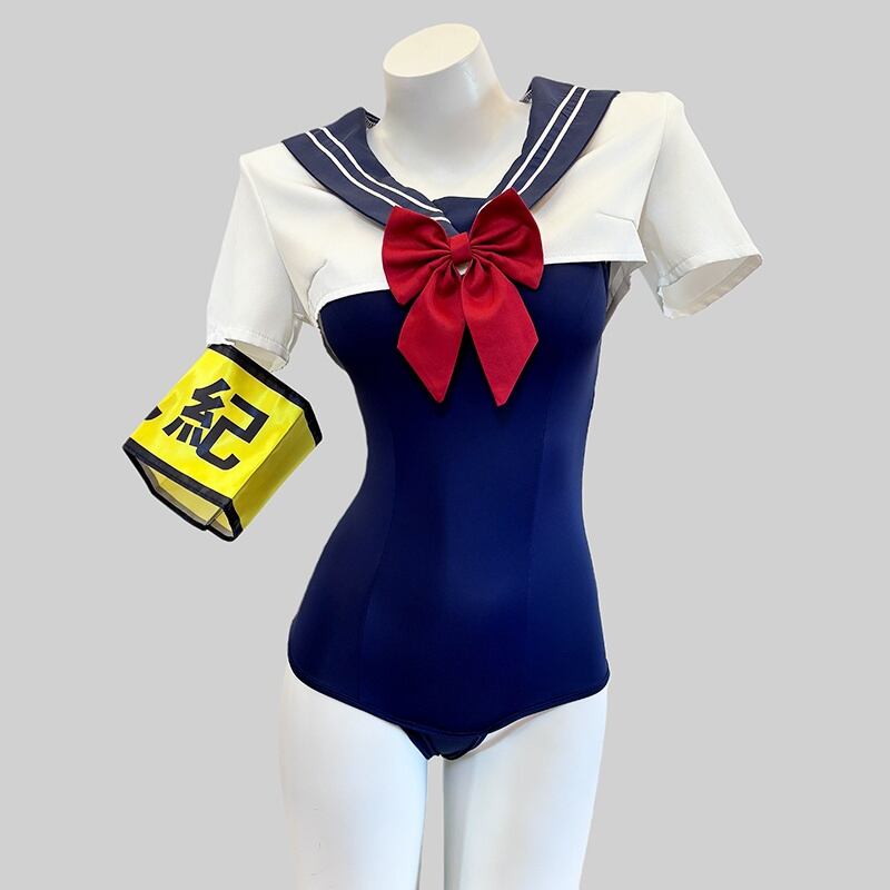 SENMHS 風紀委員モチーフ スク水風 学園コスプレ レディース 大人向け レオタード+トップス+ワッペン付き袖+リボン 4点セット 萌系 セパレートタイプ 撮影用・水着兼用 コスチュームmh30