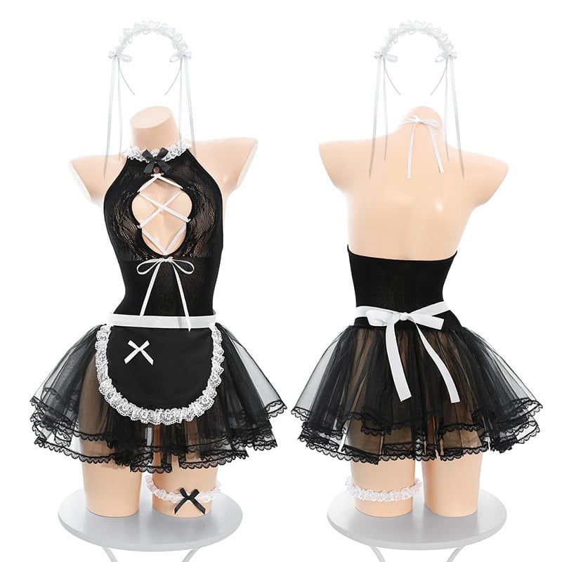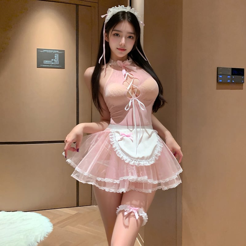 SENMHS セクシー メイド服 コスプレ 4点セット(カチューシャ+Tバック+エプロン+レッグリング+全身タイツ) 手で破れるボディスーツ 透け感フリルワンピース 萌え可愛い 派手 撮影会・パーティー・イベント用 レディースzy7437