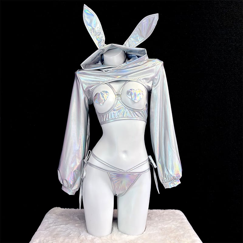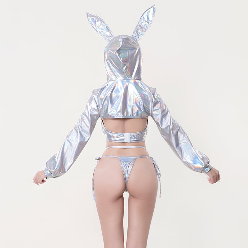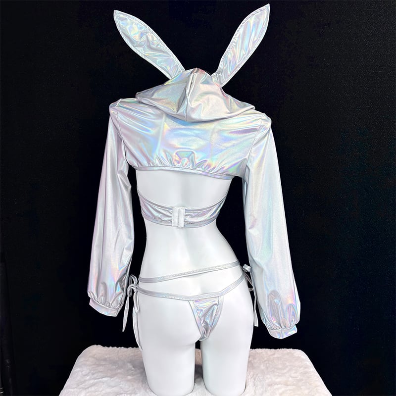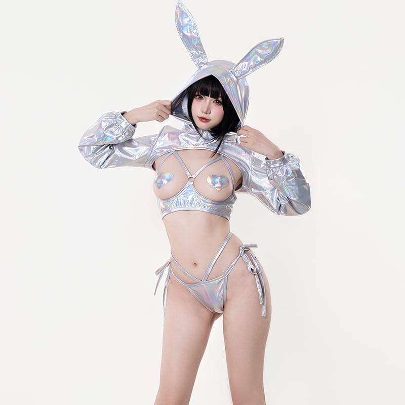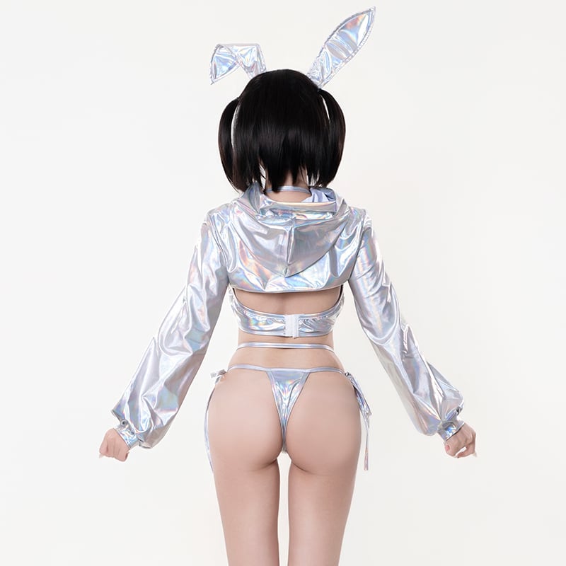 SENMHS 逆バニー バニーガール コスプレ セクシー シースルー ハイレグ レオタード うさぎ耳カチューシャ付き レディース 仮装 パーティー シルバーmh31