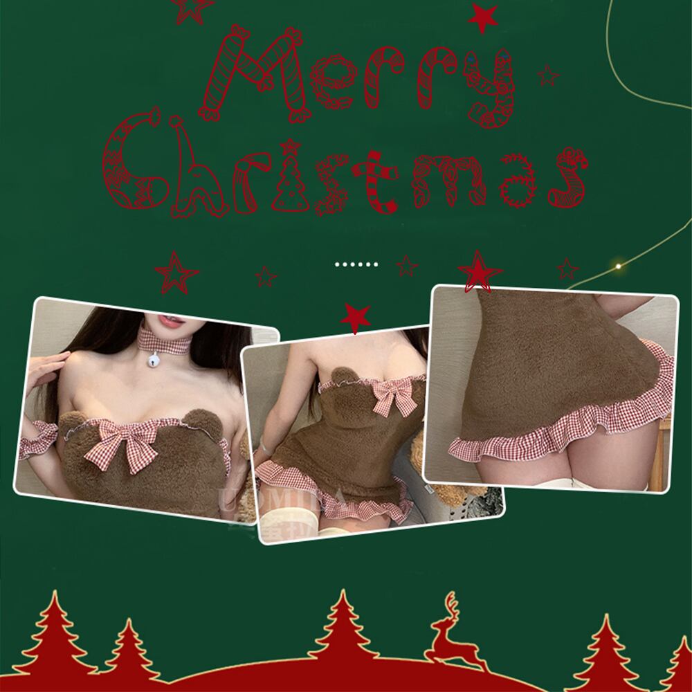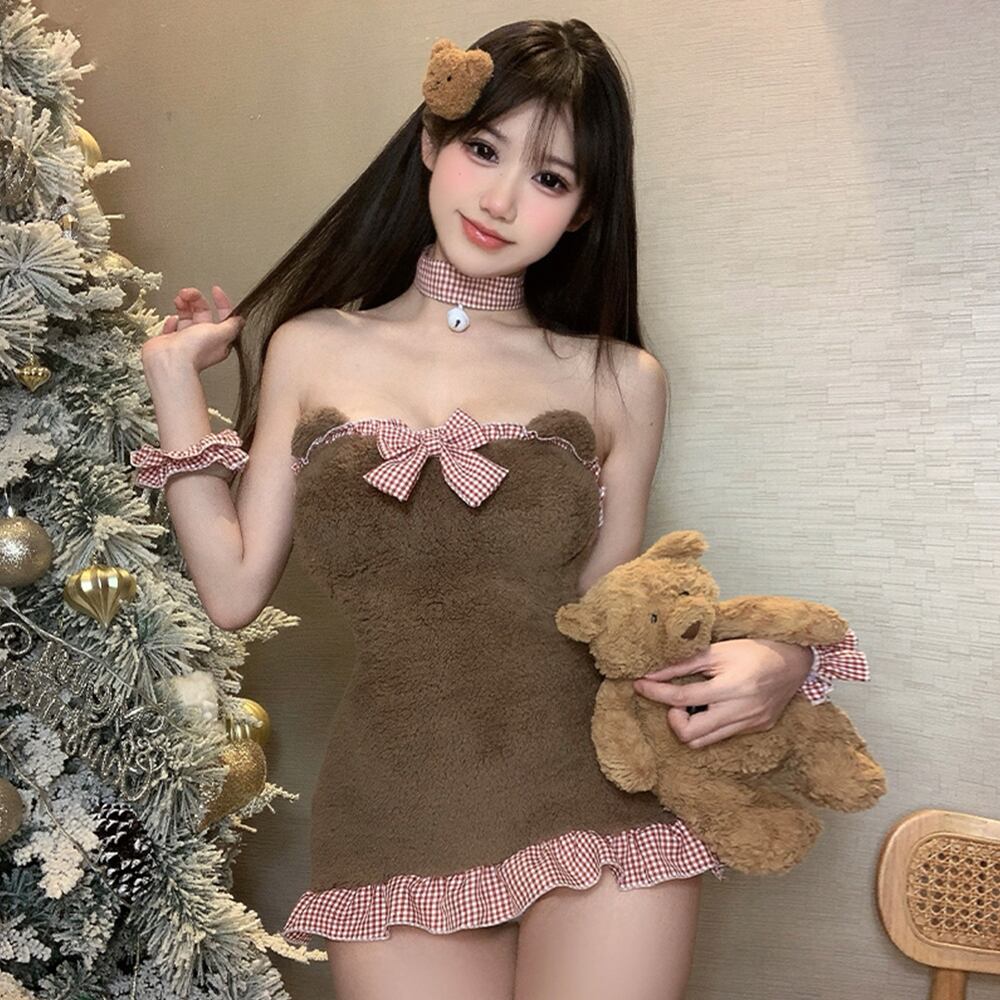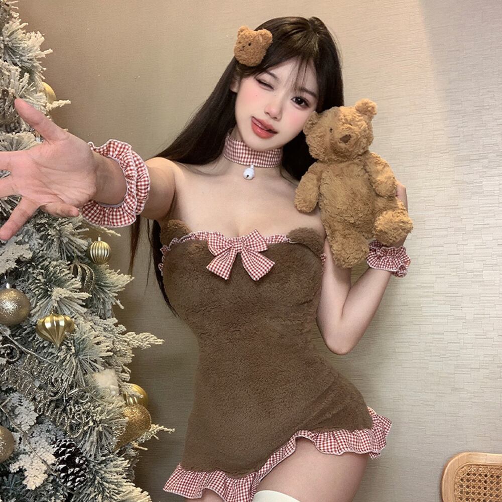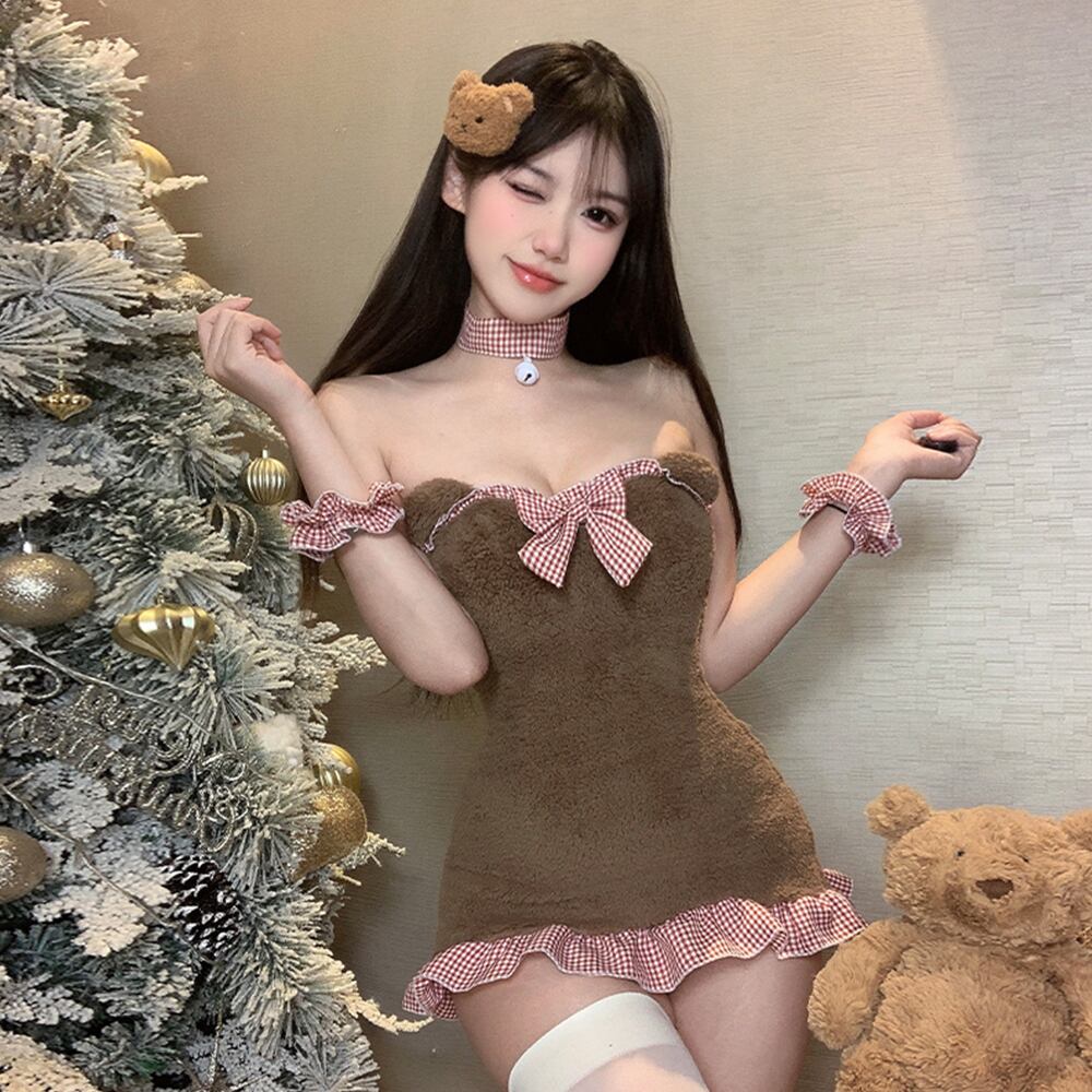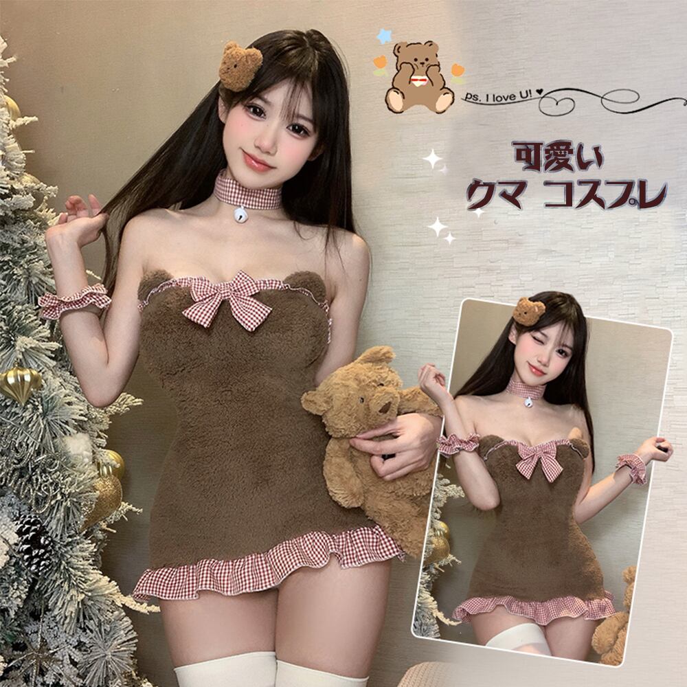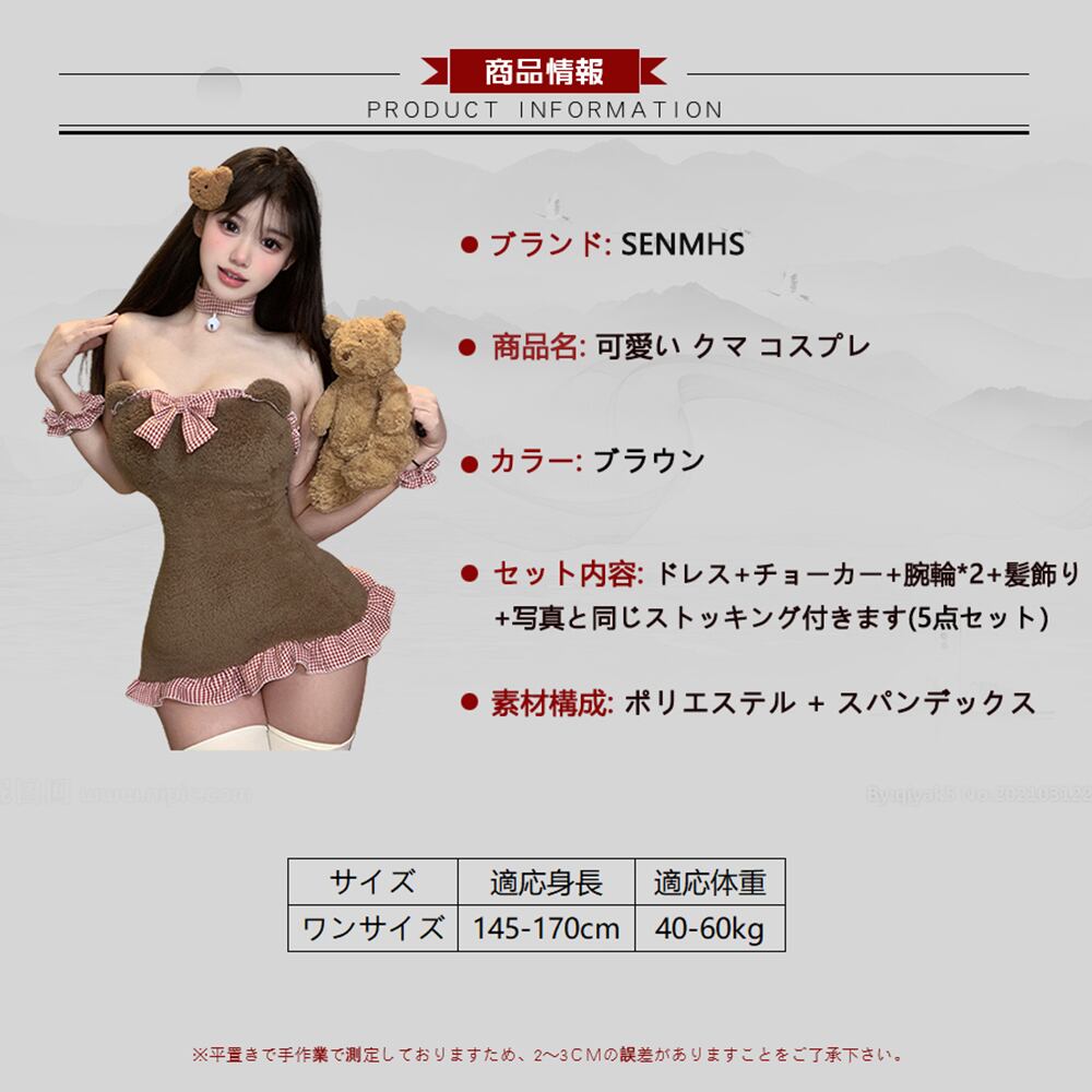 SENMHS セクシー 熊 コスプレ 萌え萌え 熊耳 ベビードール ランジェリー 下着 仮装 可愛い ミニドレス アニマル コスチューム ワンサイズ レディース 編み飾り チョーカー ドレス 腕輪 5点セットf570