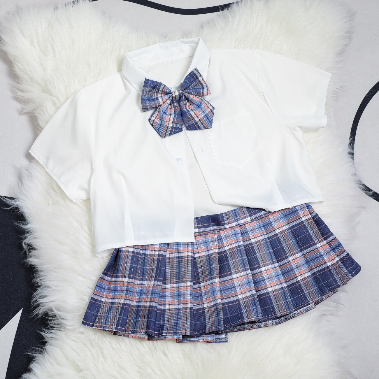 ■清楚な印象の白ブラウスに落ち着いた色合いのチェック柄を組み合わせることで、上品でクールな優等生のような印象を与える制服風デザインに仕立てました。