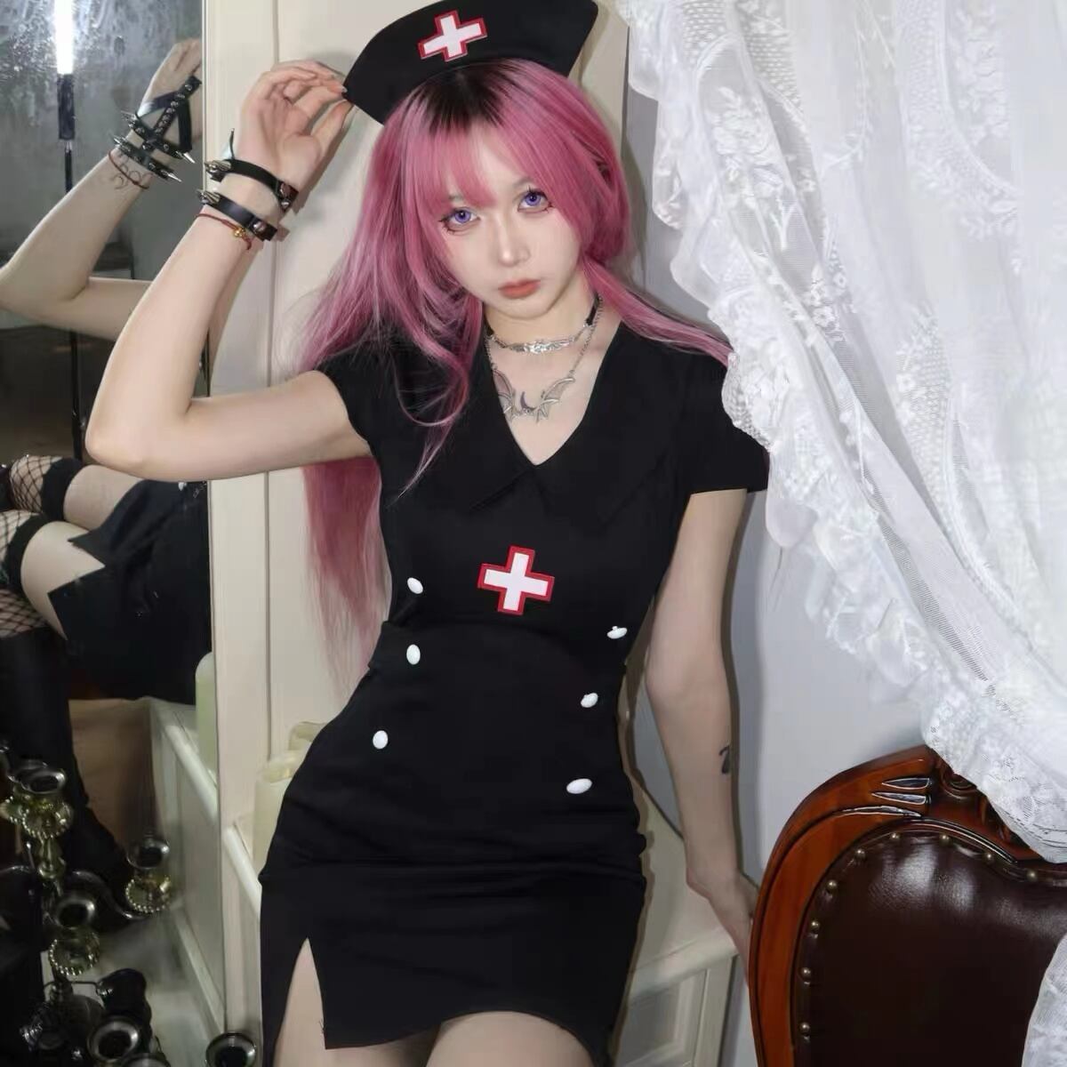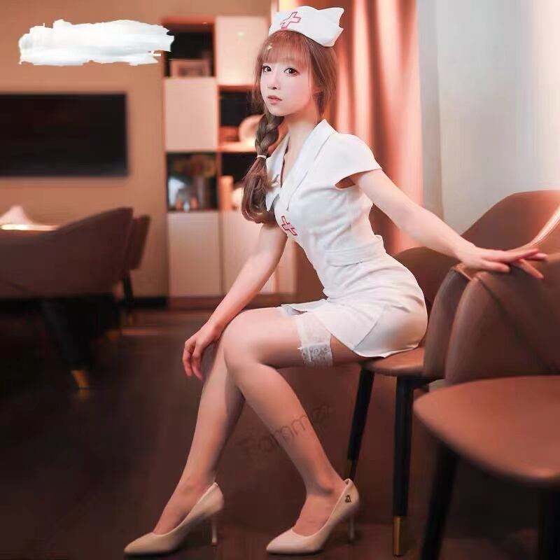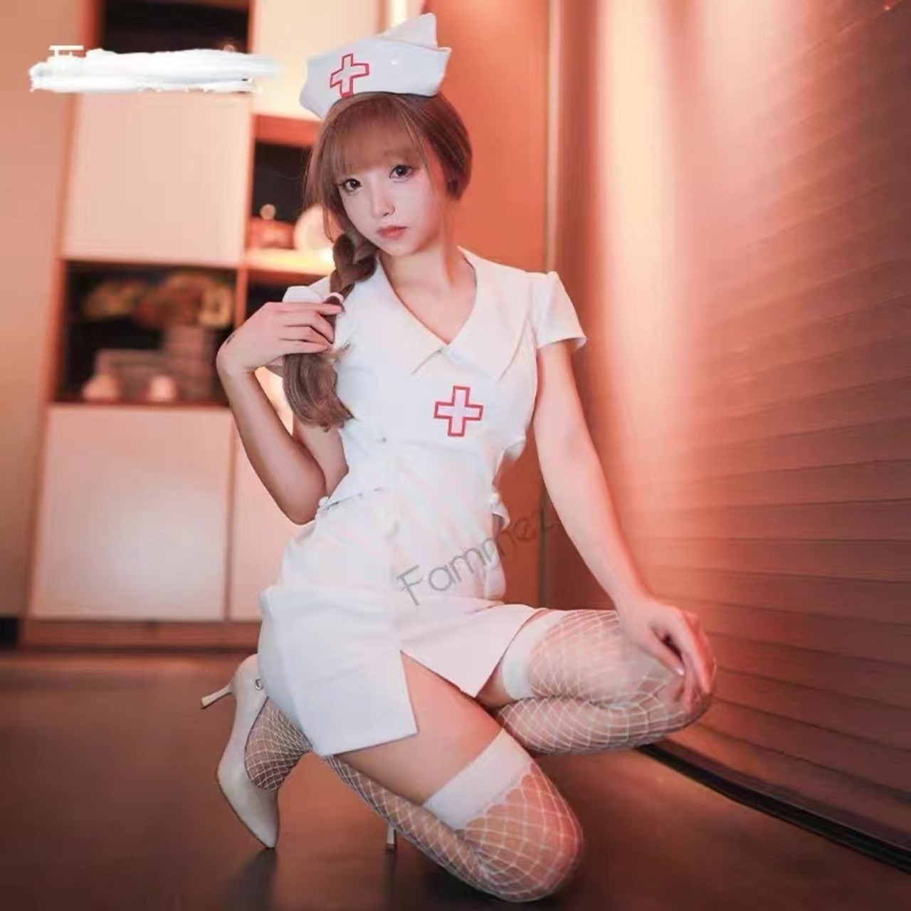 ■ナースキャップとワンピースが可愛らしさを演出します。伸縮のある生地はタイトし過ぎず、着やすさにも拘りました。ヒップラインが見えてしまいそうな危うい着丈感はドキドキ感を味わえます。