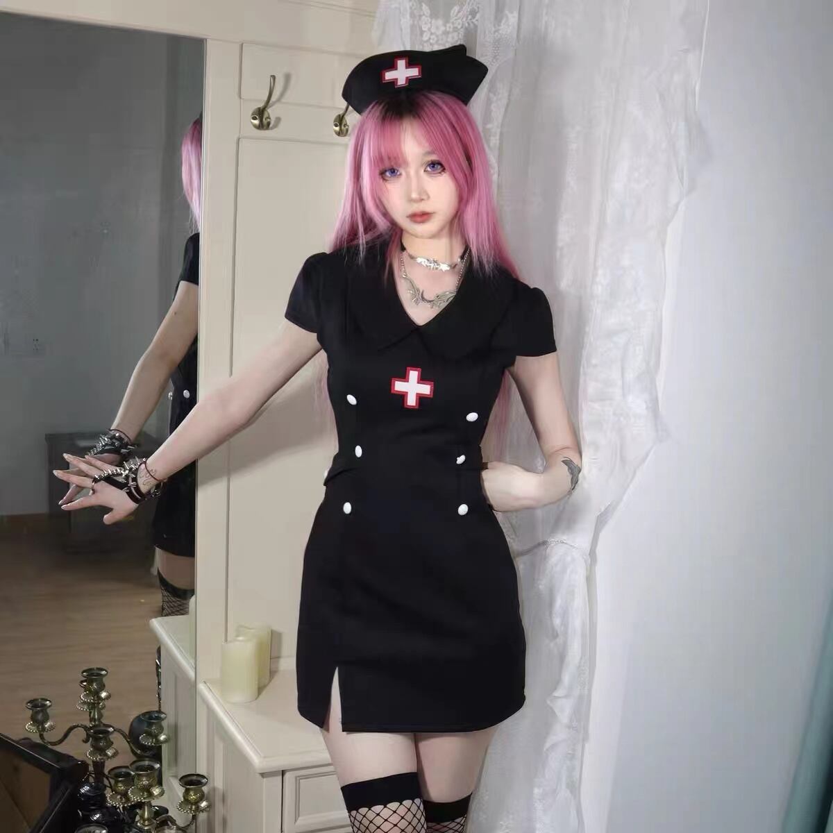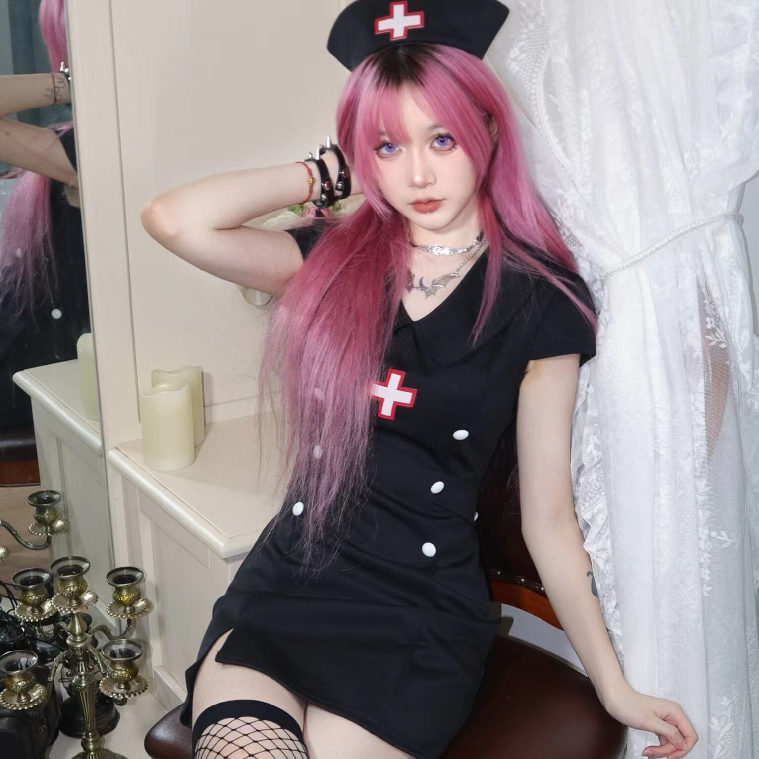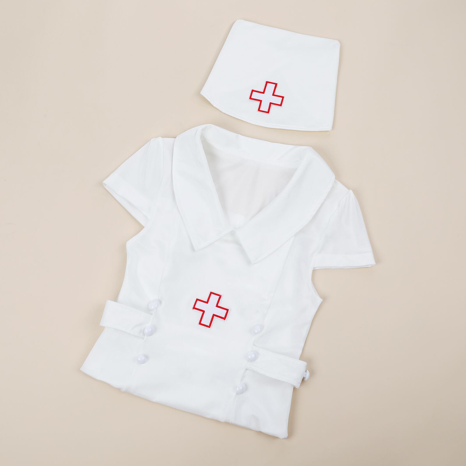 ■ナースキャップとワンピースが可愛らしさを演出します。伸縮のある生地はタイトし過ぎず、着やすさにも拘りました。ヒップラインが見えてしまいそうな危うい着丈感はドキドキ感を味わえます。