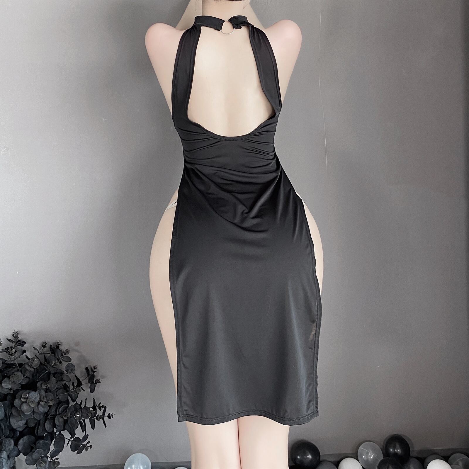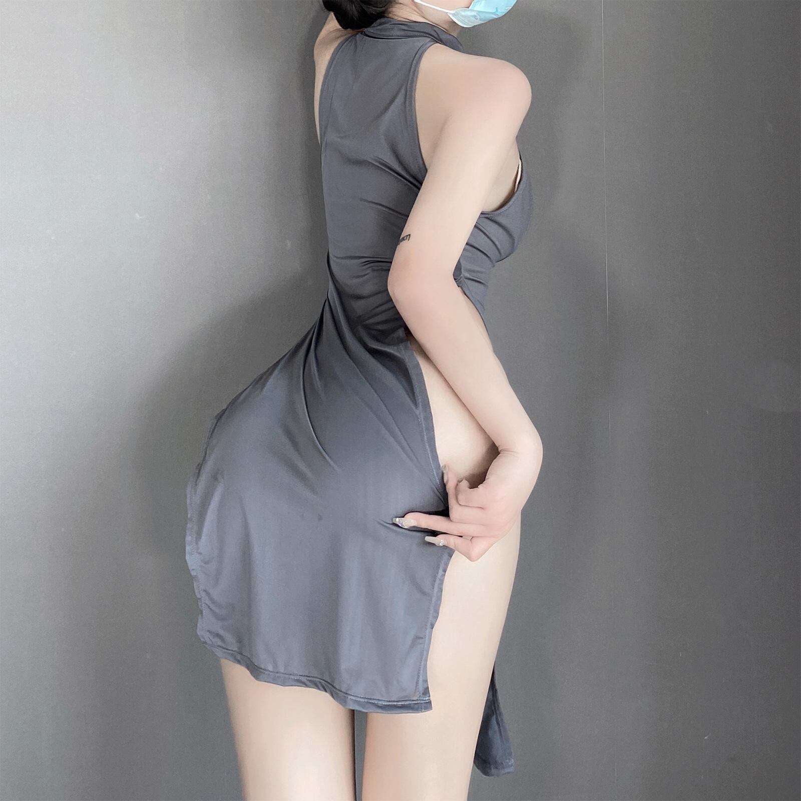 ■首元のシルバーリングにマジックテープを通し着用するデザインです。 深く入ったスリットは脚長効果もあり、動くたびに見える素肌はパートナーを誘惑できること間違いなし。
