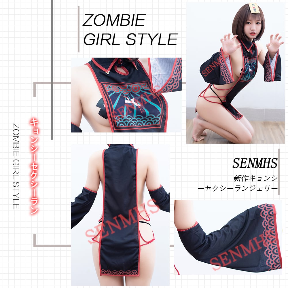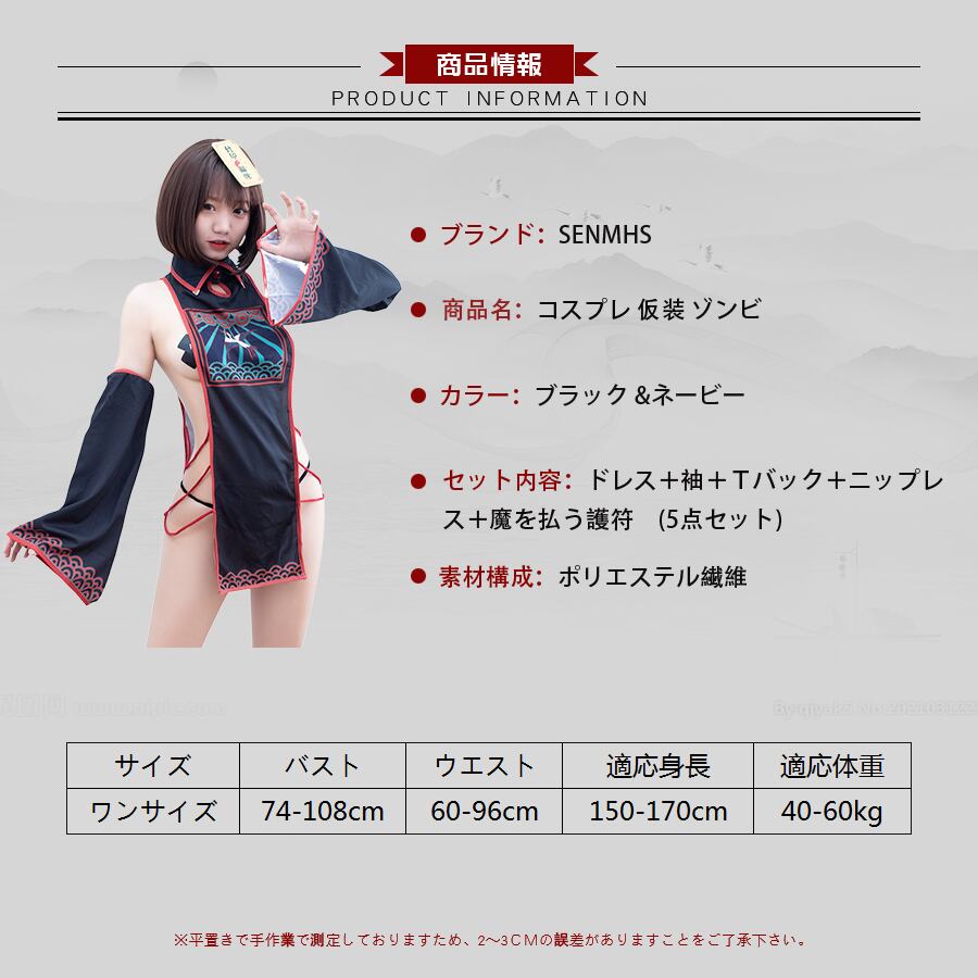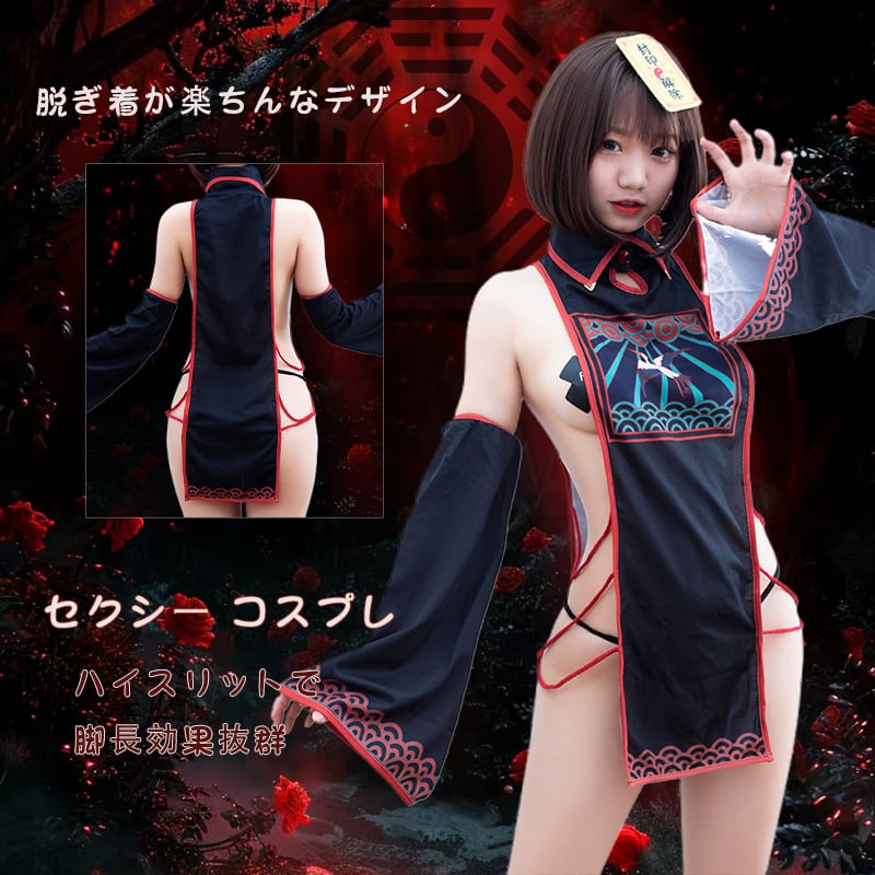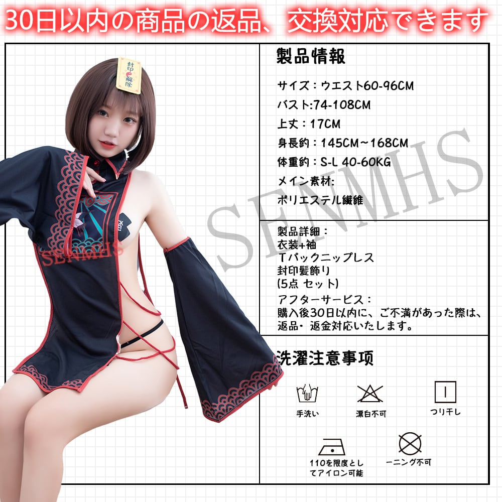SENMHS キョンシー コスプレ 仮装 中国 ゾンビ ホラー セクシー チャイナ ランジェリーコスチューム 過激 下着 小悪魔コスプレ 【ドレス 袖 Tバック ニップレス 魔を払う護符 】5点セット7003