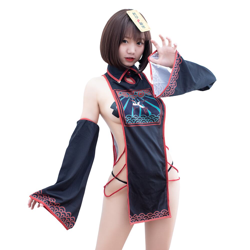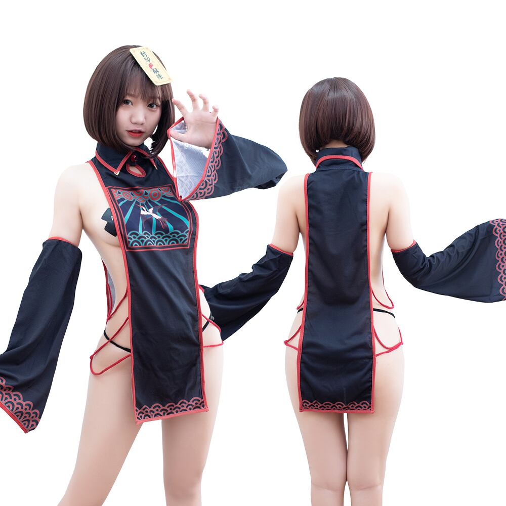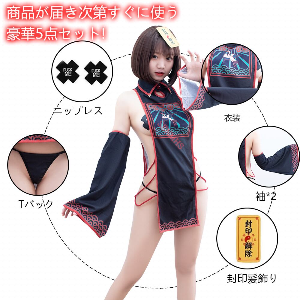 SENMHS キョンシー コスプレ 仮装 中国 ゾンビ ホラー セクシー チャイナ ランジェリーコスチューム 過激 下着 小悪魔コスプレ 【ドレス 袖 Tバック ニップレス 魔を払う護符 】5点セット7003
