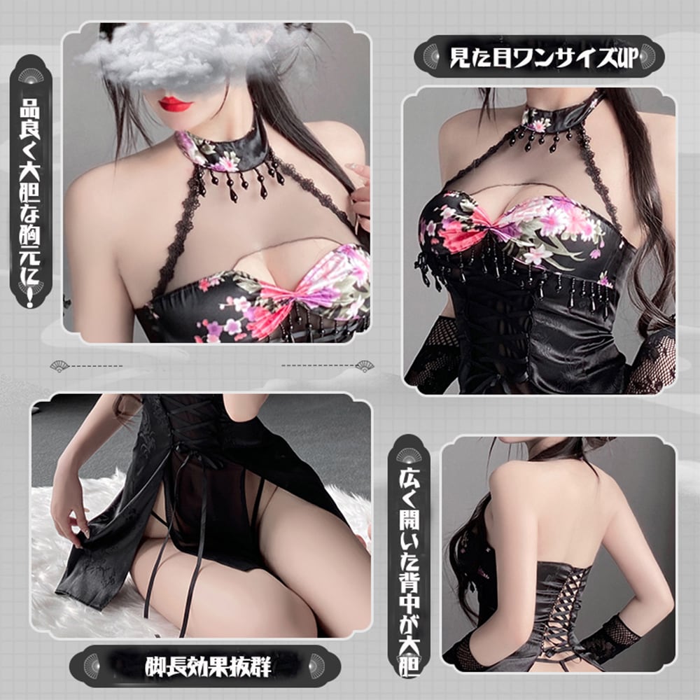 SENMHS セクシー コスプレチャイナ チャイナドレス 過激 エッチ な えろい ボディコン チャイナ服 ランジェリー下着 ワンピース ミニ コスチューム ドレス 可愛い ハロウィンレディース 手袋 ストッキング付き ブラック6659