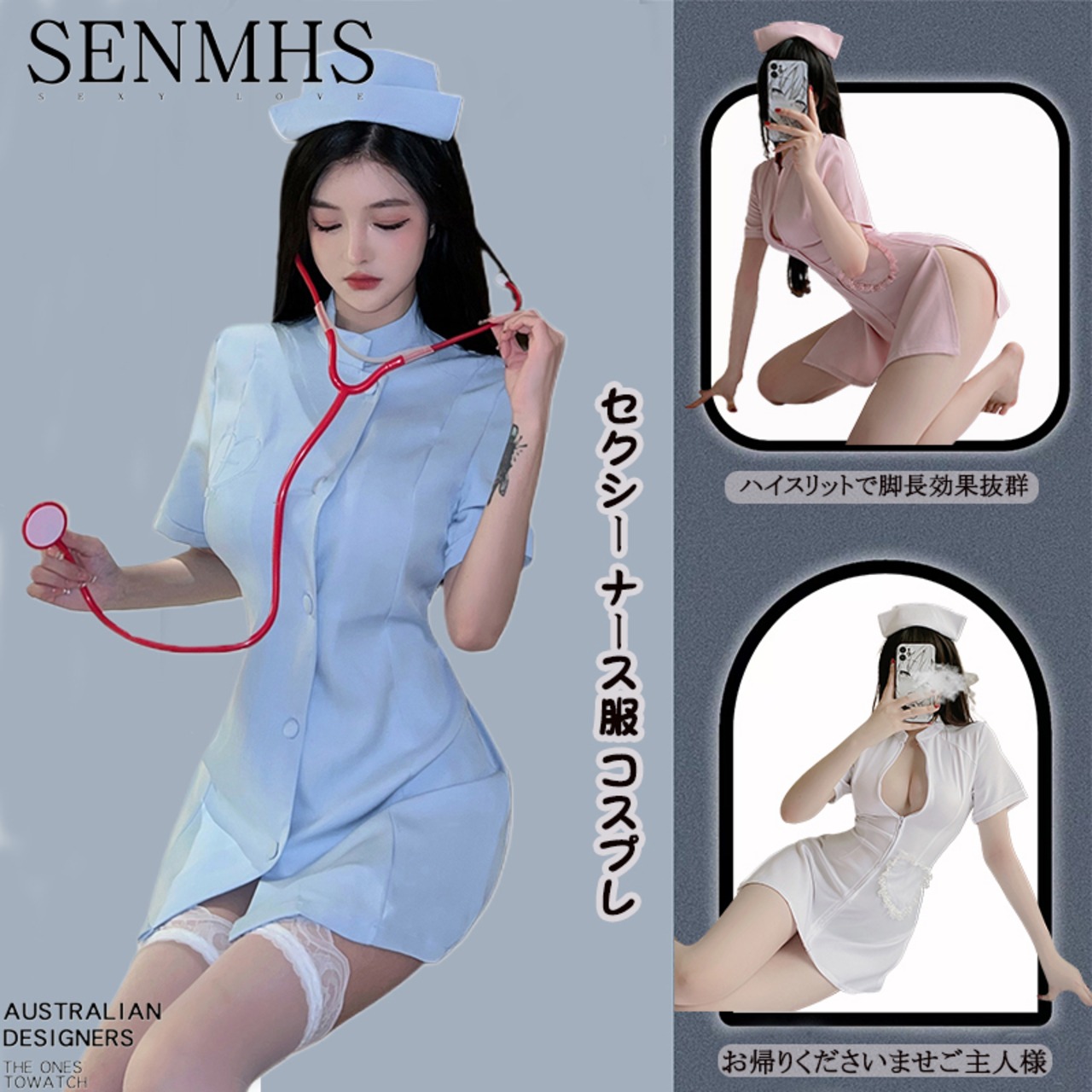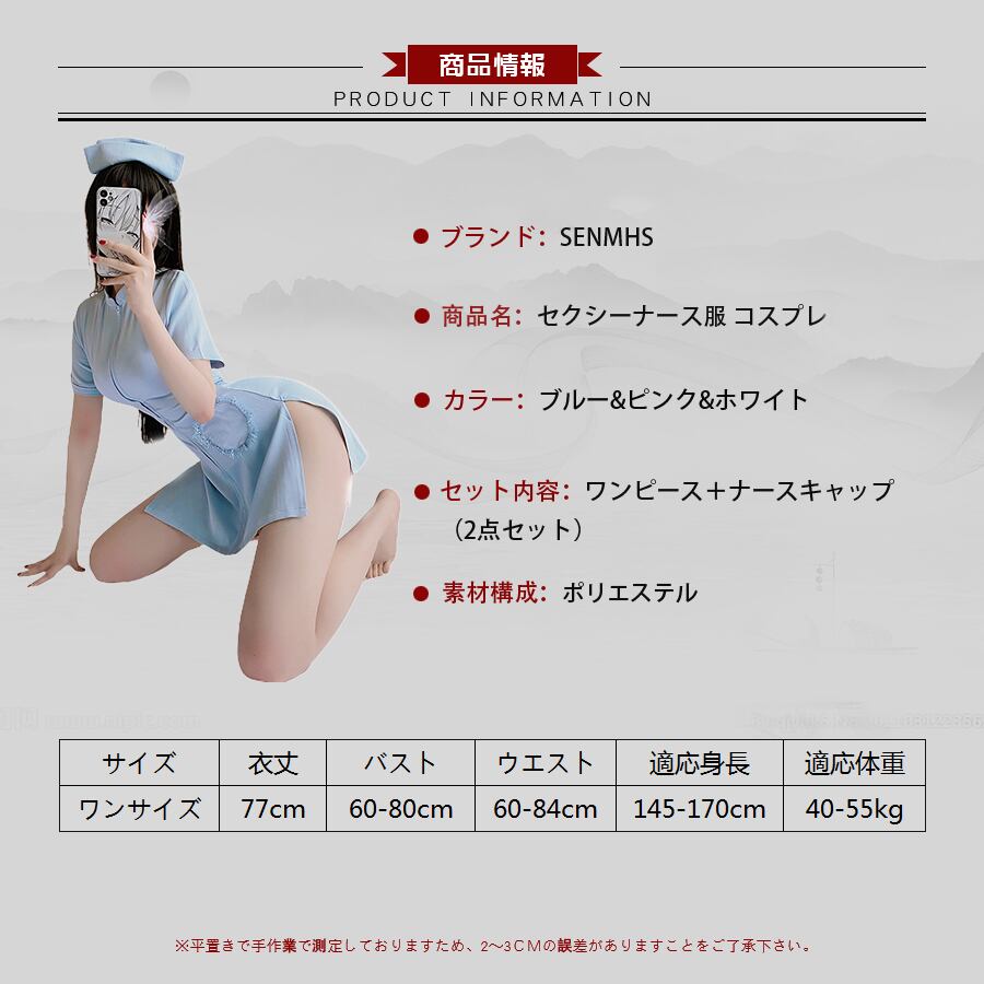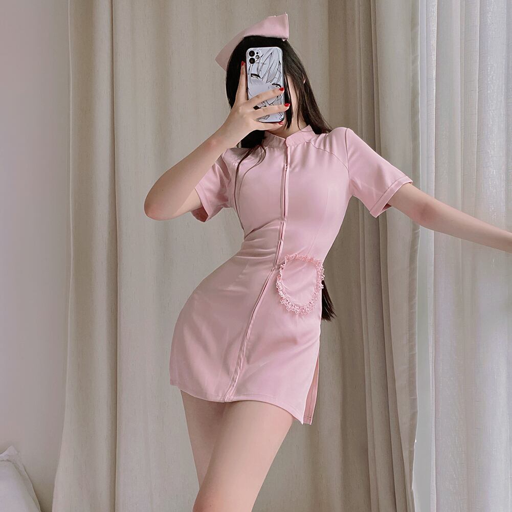 ■ナースキャップとワンピースが可愛らしさを演出します。伸縮のある生地はタイト過ぎず、着やすさにも拘りました。ヒップラインが見えてしまいそうな危うい着丈感はドキドキ感を味わえます。