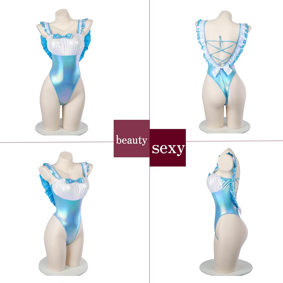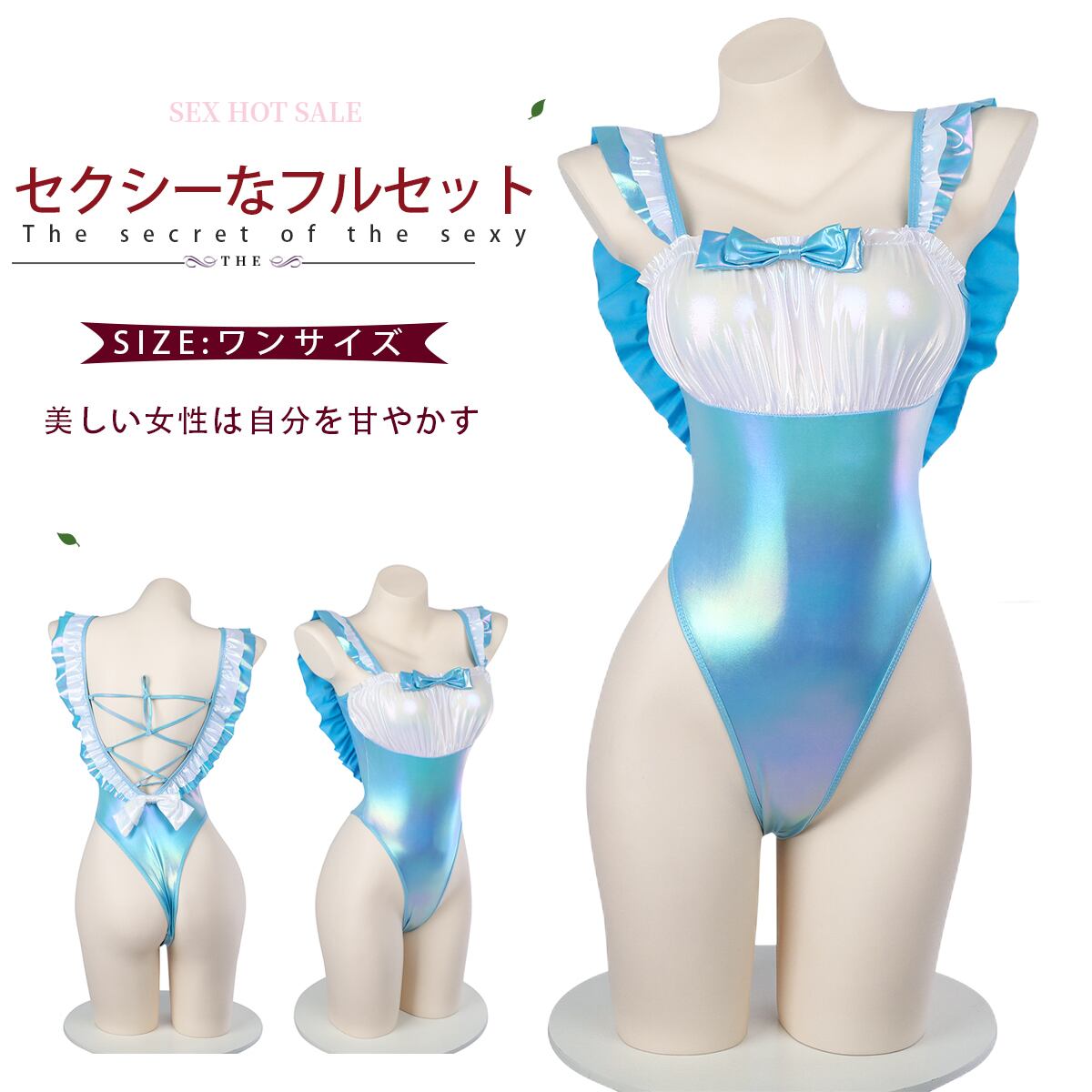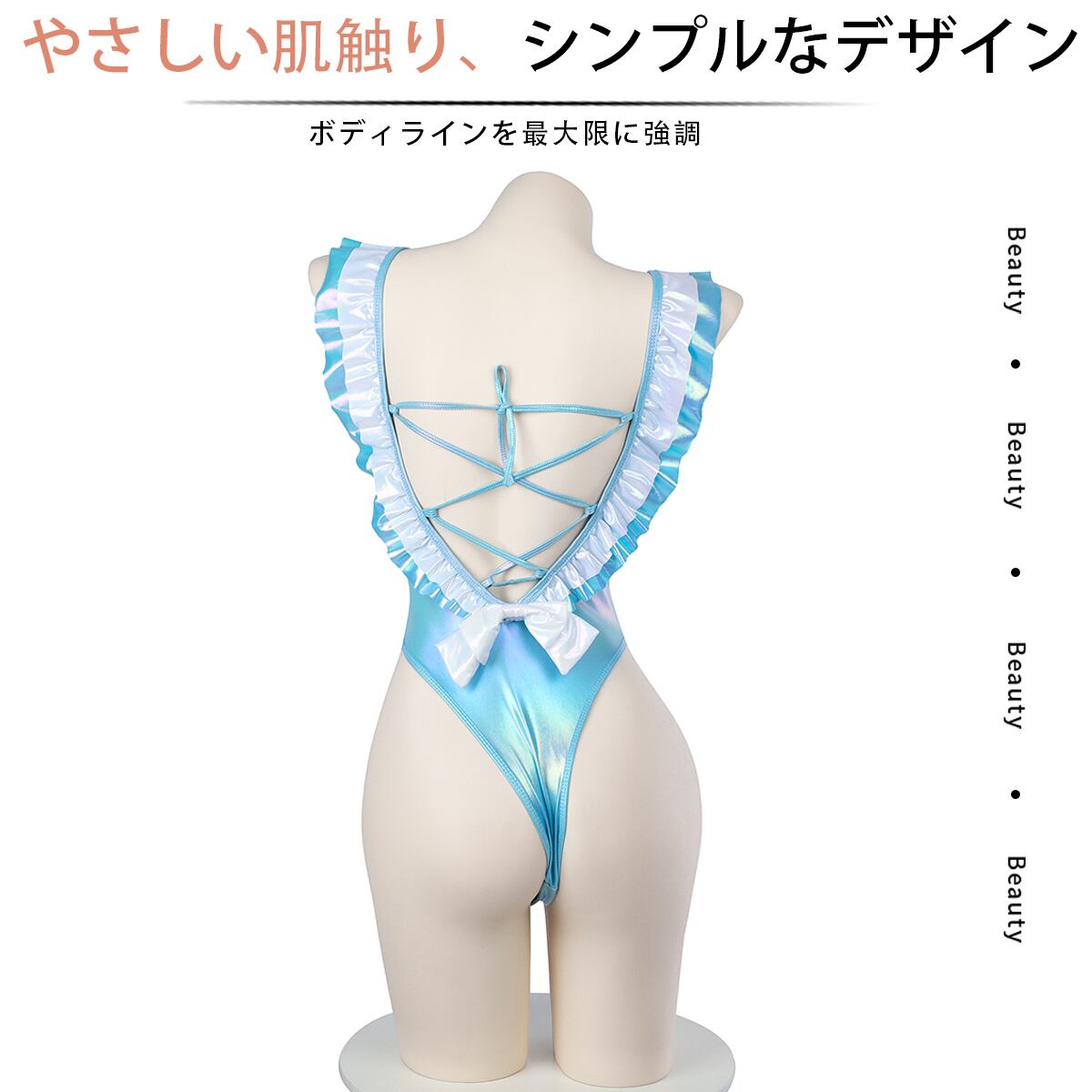 ■光沢感のある素材で肌の露出が多いデザイン。テカテカと光る煌めきが、心をギラつかせる無機質な印象ながら光沢感が蠢く生き物を連想させ、女性のセクシーさが絡み合い、ココロとアタマはパニック状態で大興奮。