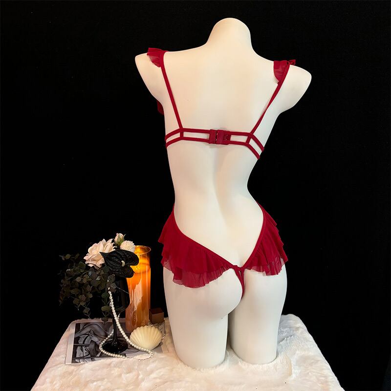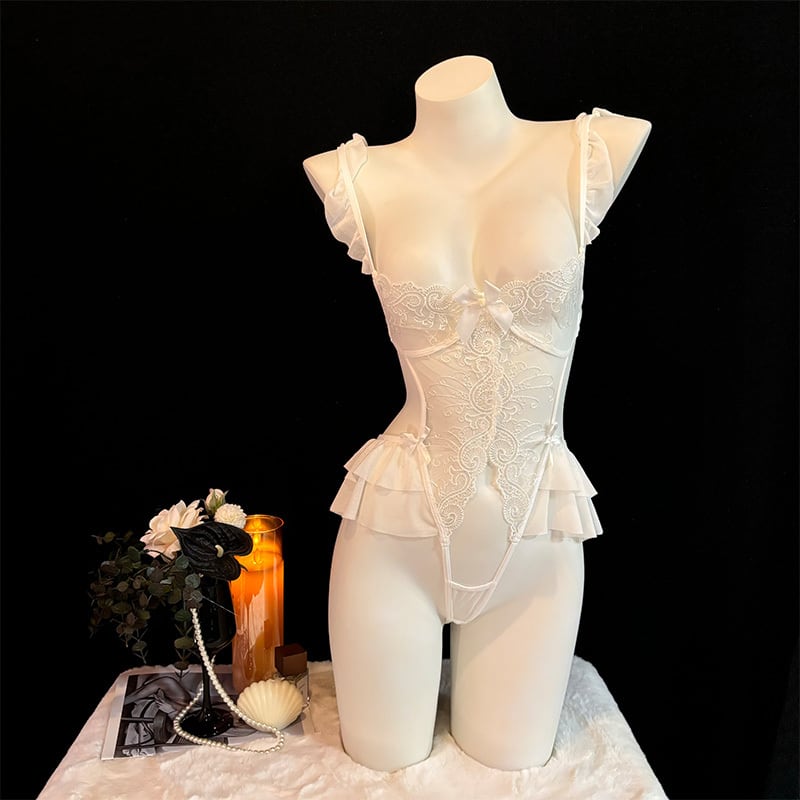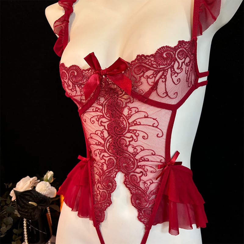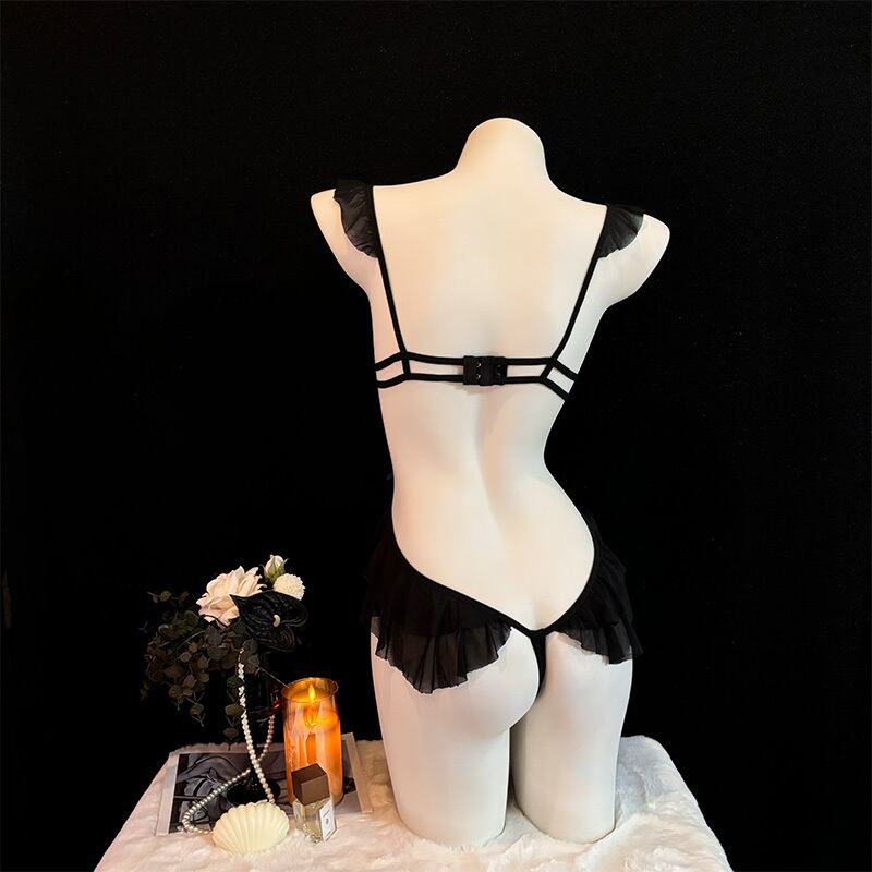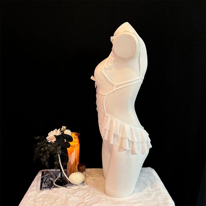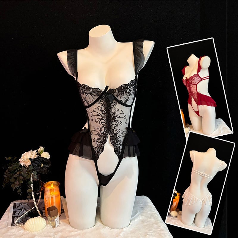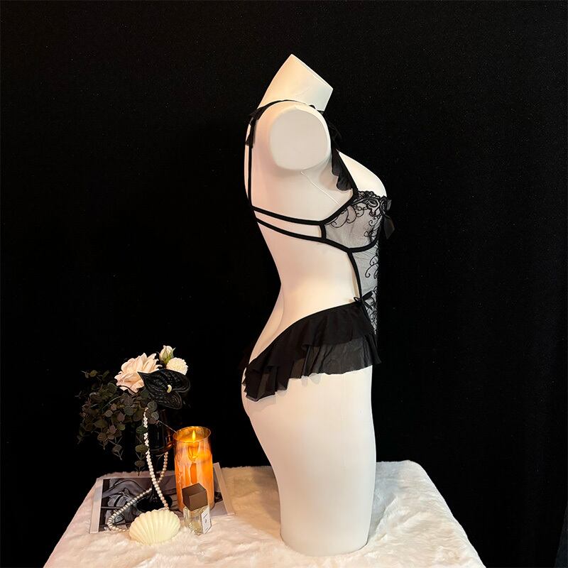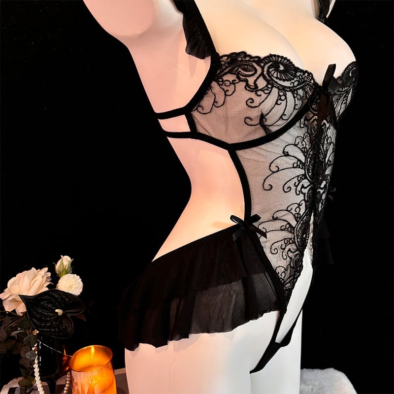 ■レースから覗く素肌が映えるランジェリー。ほどよい伸縮性のメッシュレースに、動くたび揺れるフリンジを合わせることで大人の色気を放つ美しいベビードールに仕立てました