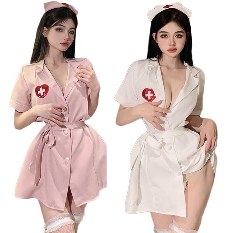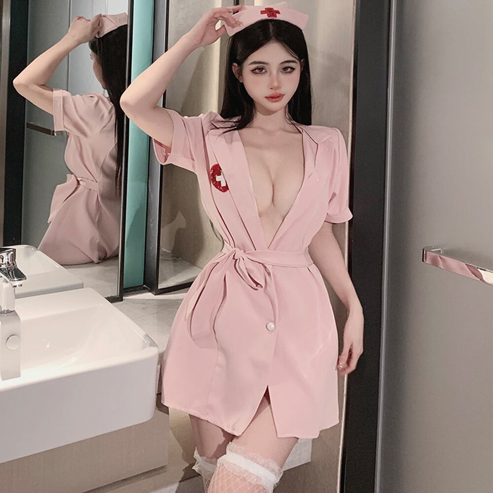 ■ヒップラインギリギリの超ミニ丈のワンピースはストレッチ素材でボディにフィットしベースのピンクにレッドカラーを入れスッキリとした印象を作り色気溢れるナースを演出。