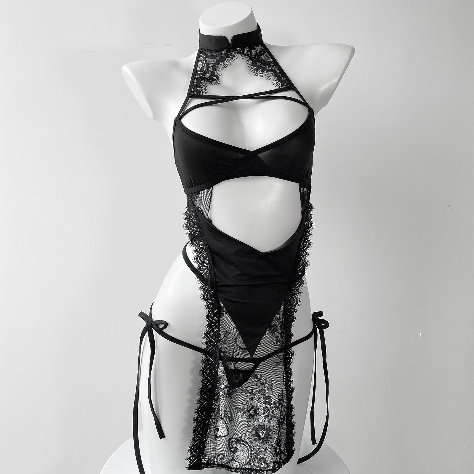 SENMHS セクシー チャイナ コスプレ 過激 エッチ な えろい 可愛い 中華 チャイナ風 チャイナ服 スリップ シースルー チャイナドレス ロング 仮装ハロウィン レディース フリーサイズ 黒 ストッキング カチューシャ付き2574