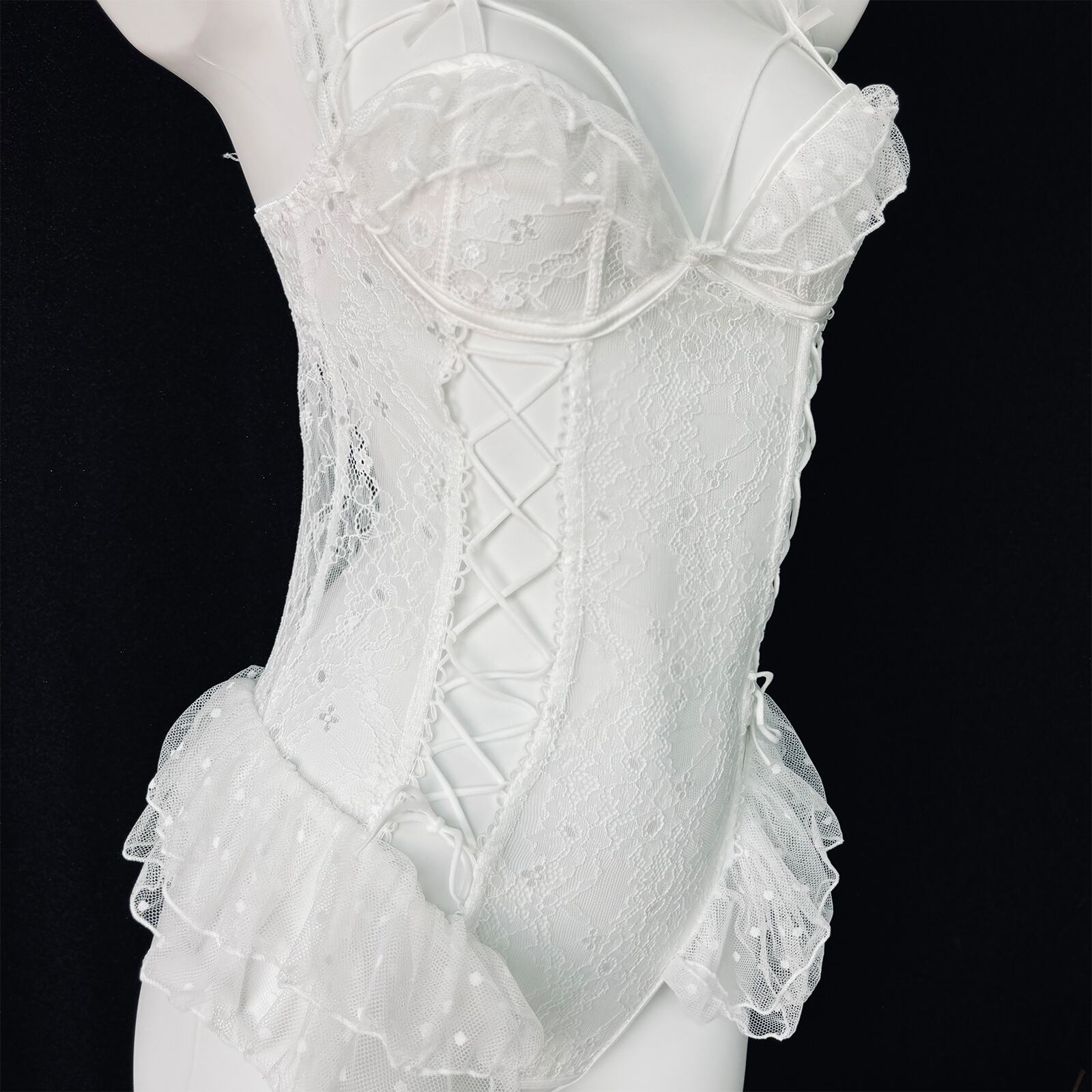 ■レースから覗く素肌が映えるランジェリー。ほどよい伸縮性のメッシュレースに、動くたび揺れるフリンジを合わせることで大人の色気を放つ美しいベビードールに仕立てました