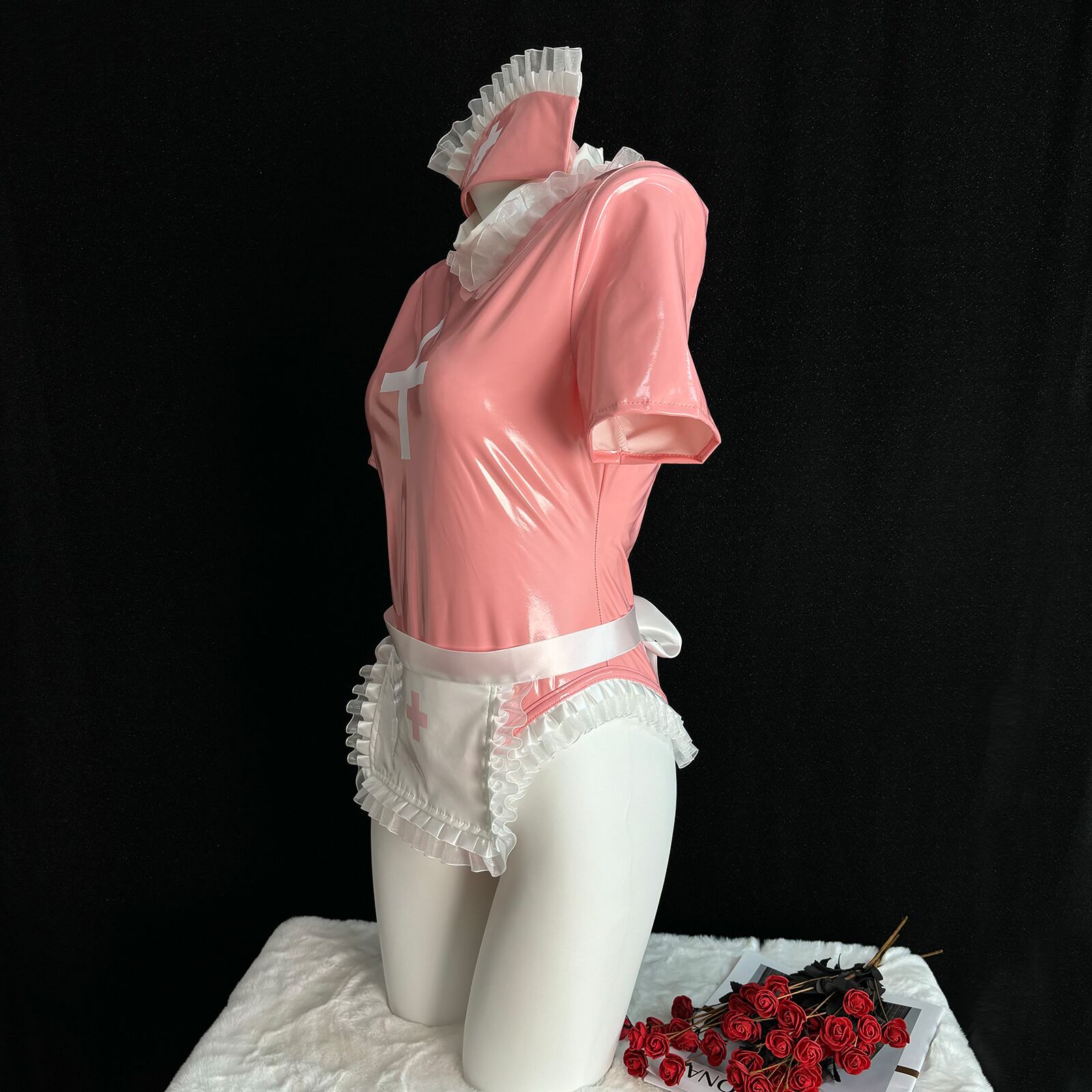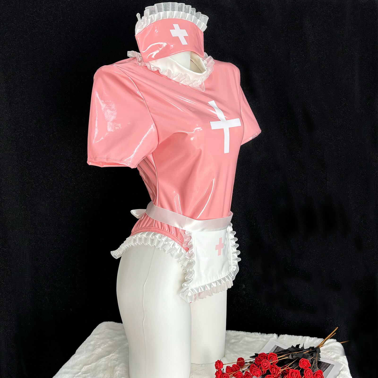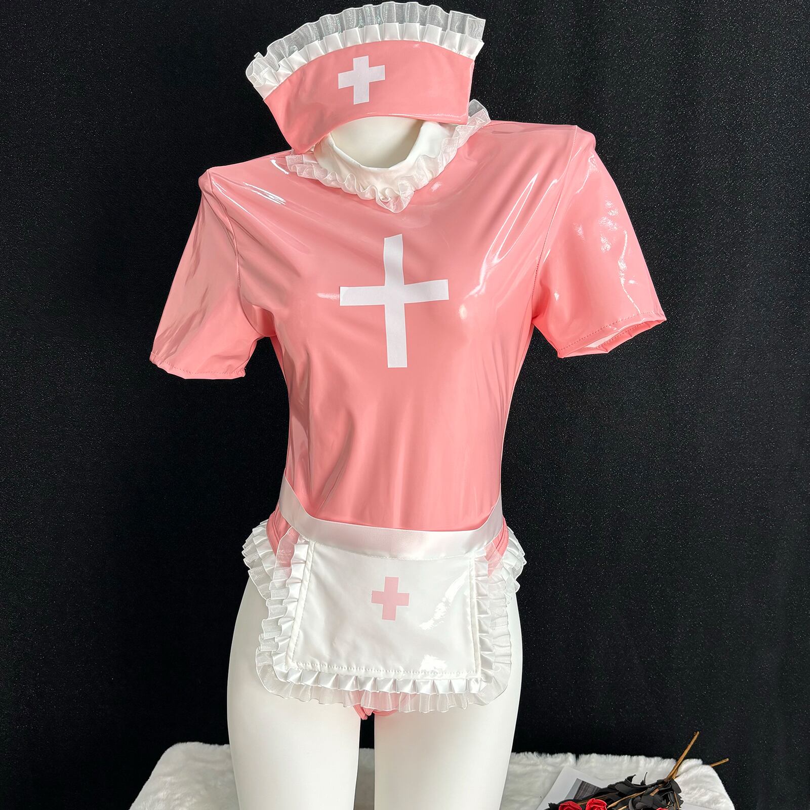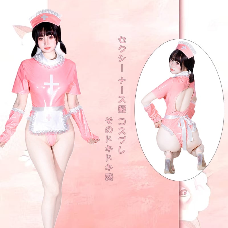 SENMHS セクシー コスプレ ナース ナース服 制服 ボンデージ エロ エプロン 看護婦 nurse ランジェリー PU レザー 調教 エッチ な 萌え コスチューム レディース 仮装 ワンサイズ ピンク カチューシャ レオタード 手袋 エプロン 5点セットMH15