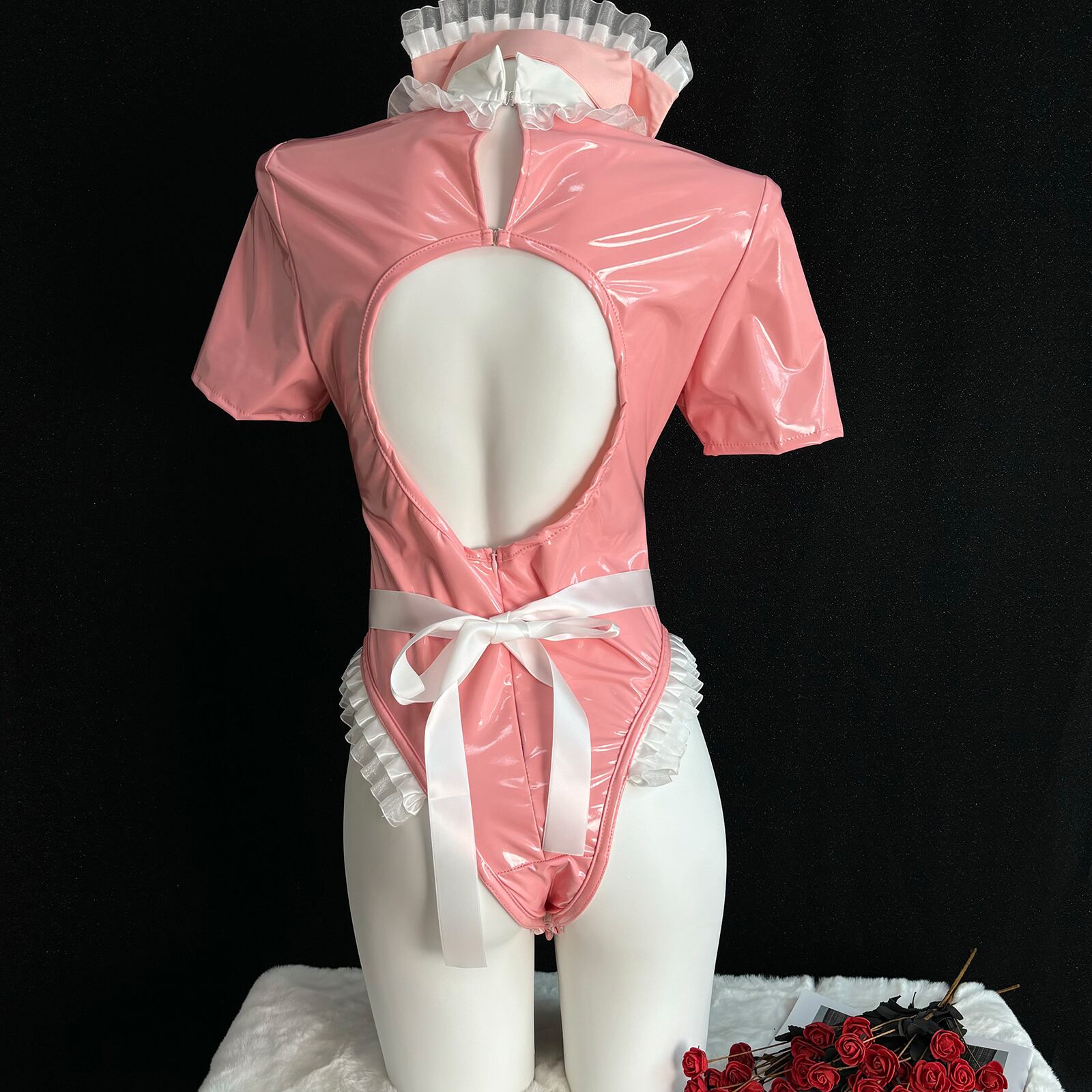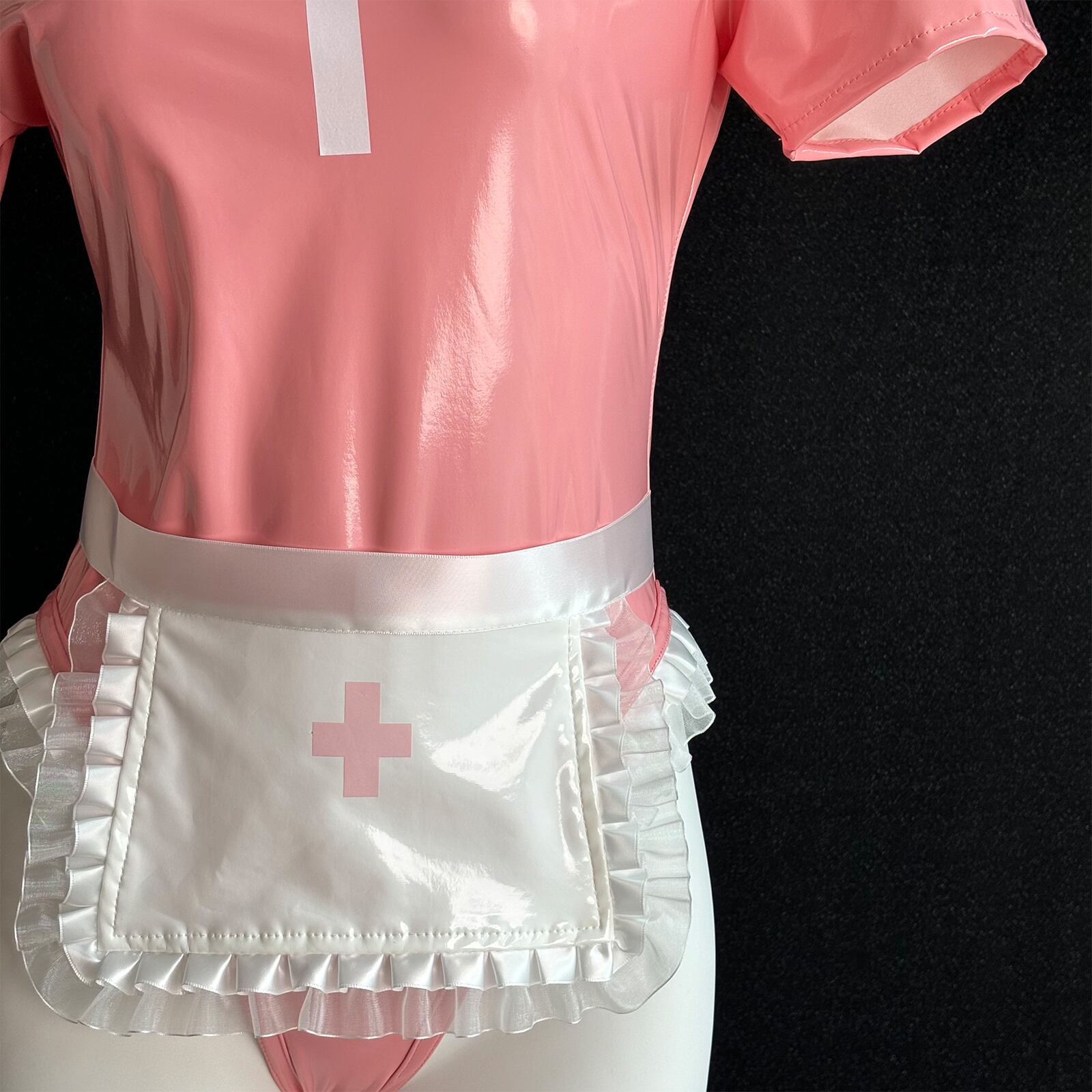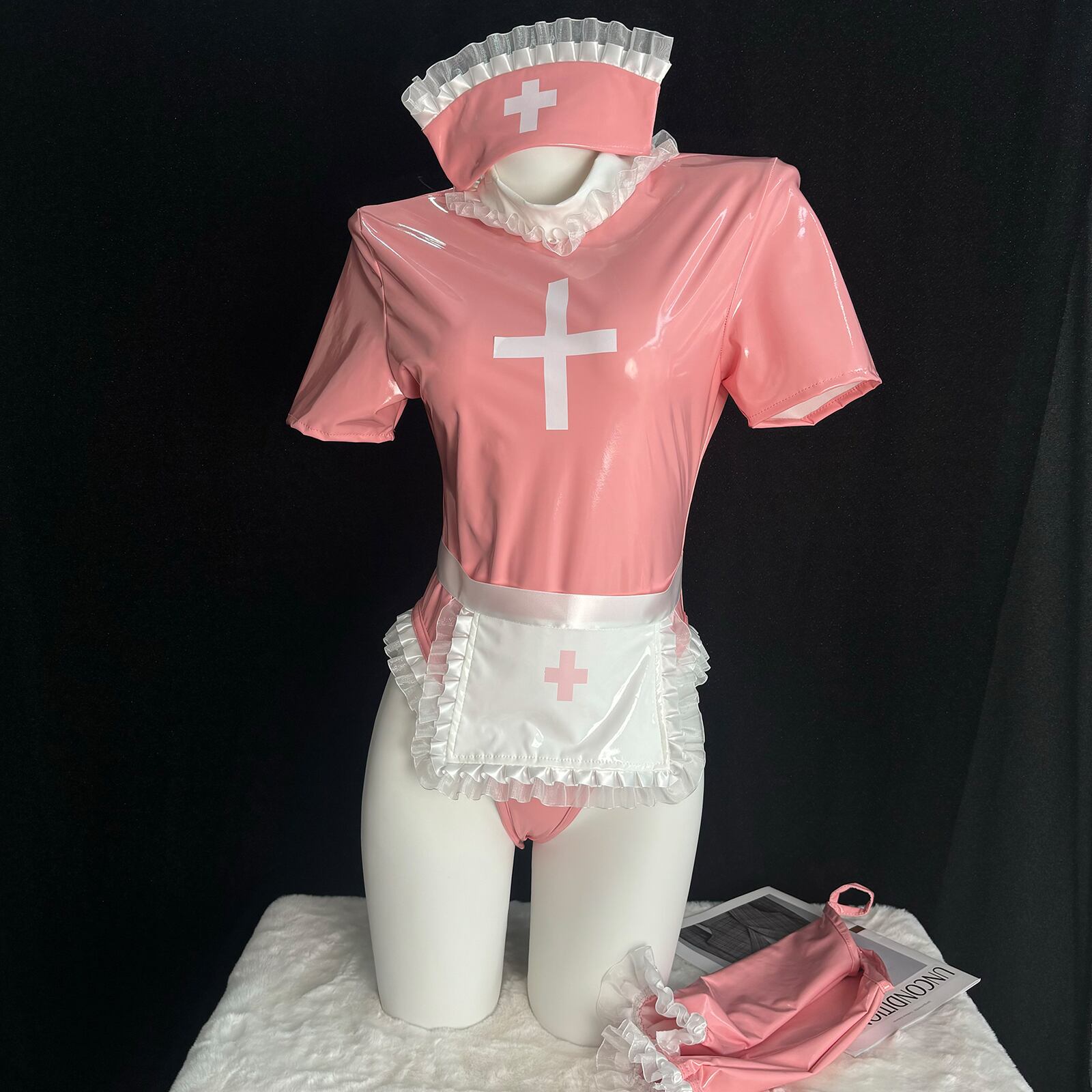 SENMHS セクシー コスプレ ナース ナース服 制服 ボンデージ エロ エプロン 看護婦 nurse ランジェリー PU レザー 調教 エッチ な 萌え コスチューム レディース 仮装 ワンサイズ ピンク カチューシャ レオタード 手袋 エプロン 5点セットMH15
