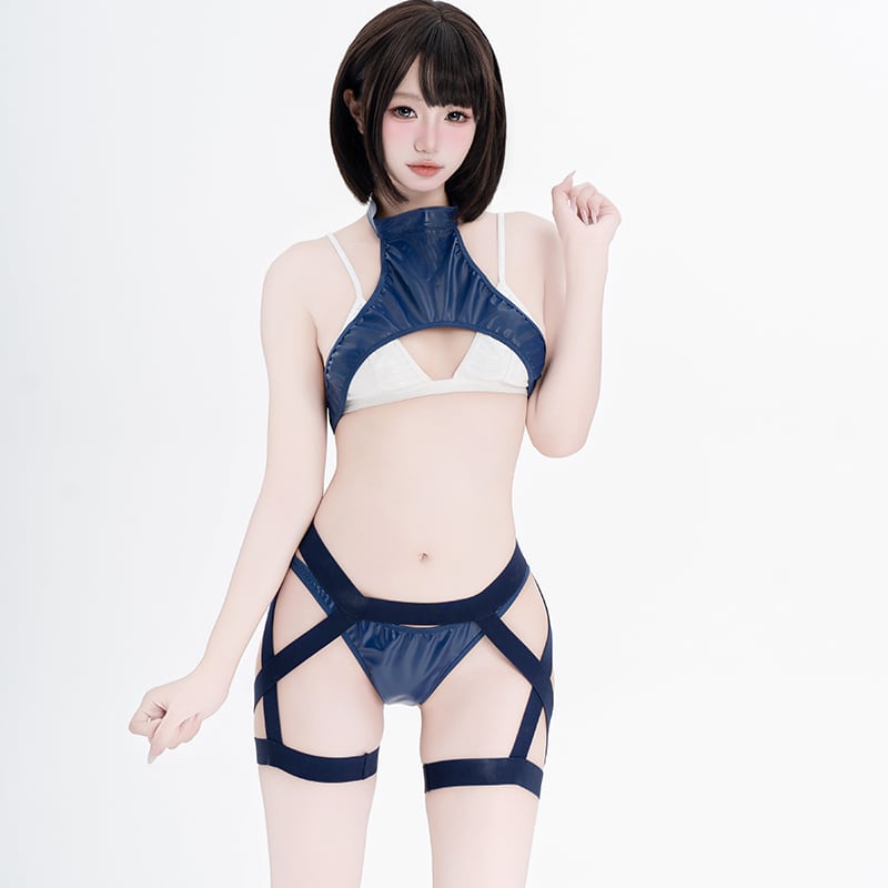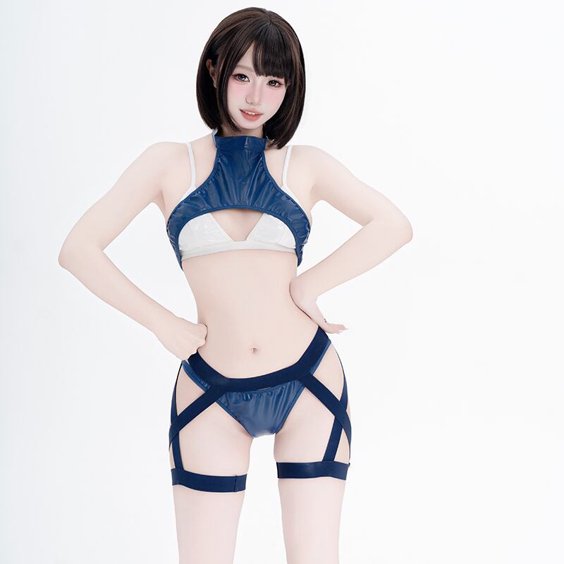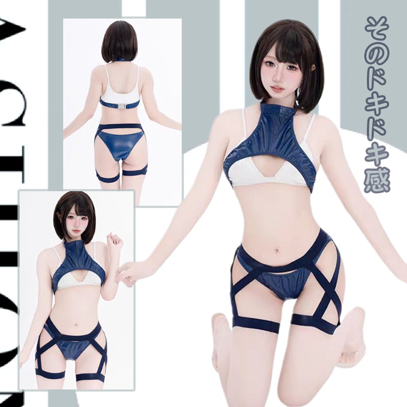 ■ スポーティー&セクシーに気分を盛り上げるレオタード。セクシーなネイビー色をベースにスポーティな流線型の差し色を添えたセクシーレオタード。