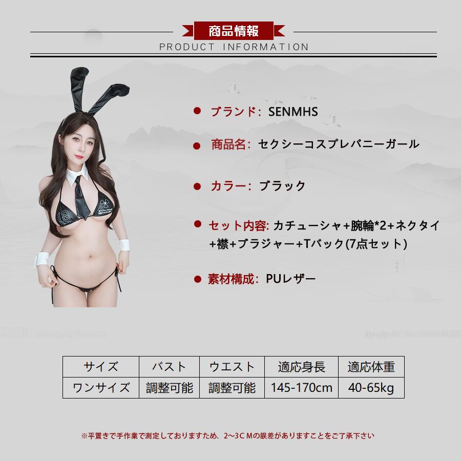 SENMHS サイバーパック オリジナル コスプレ セクシー ビキニ PUレザー バニーガール エロ 調教 誘惑 過激 うさぎ バニー コスチューム 仮装 大胆 ランジェリー レディース ワンサイズ ブラック カチューシャ 襟 ネクタイ ブラジャー Tバック 腕輪 7点セットpc04n