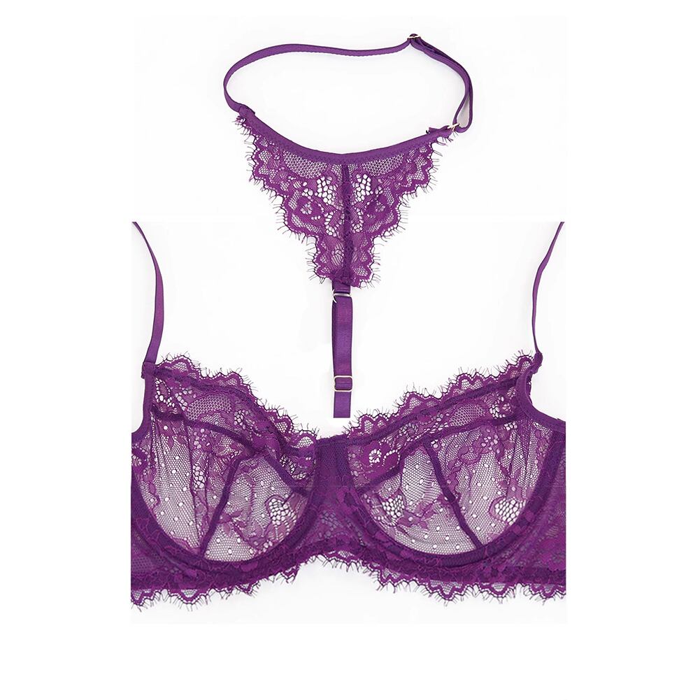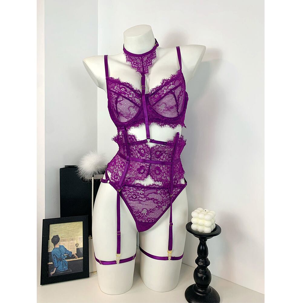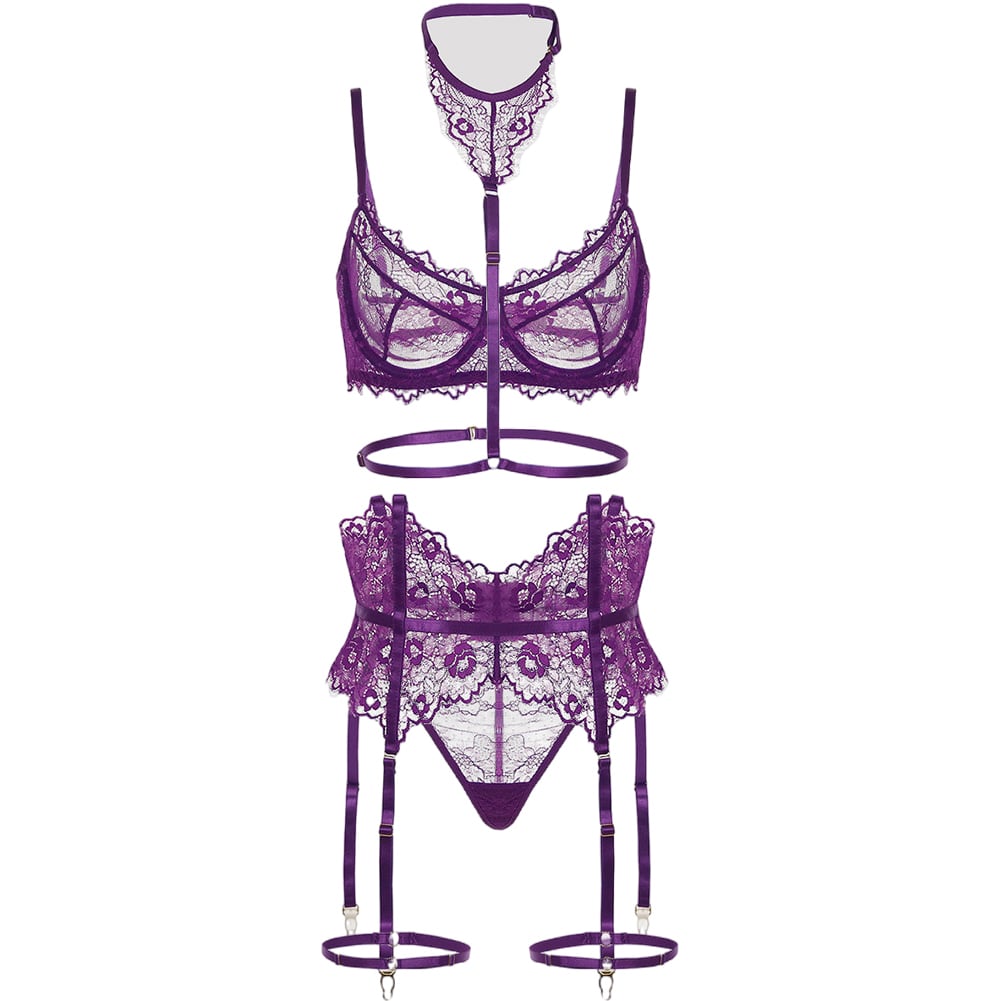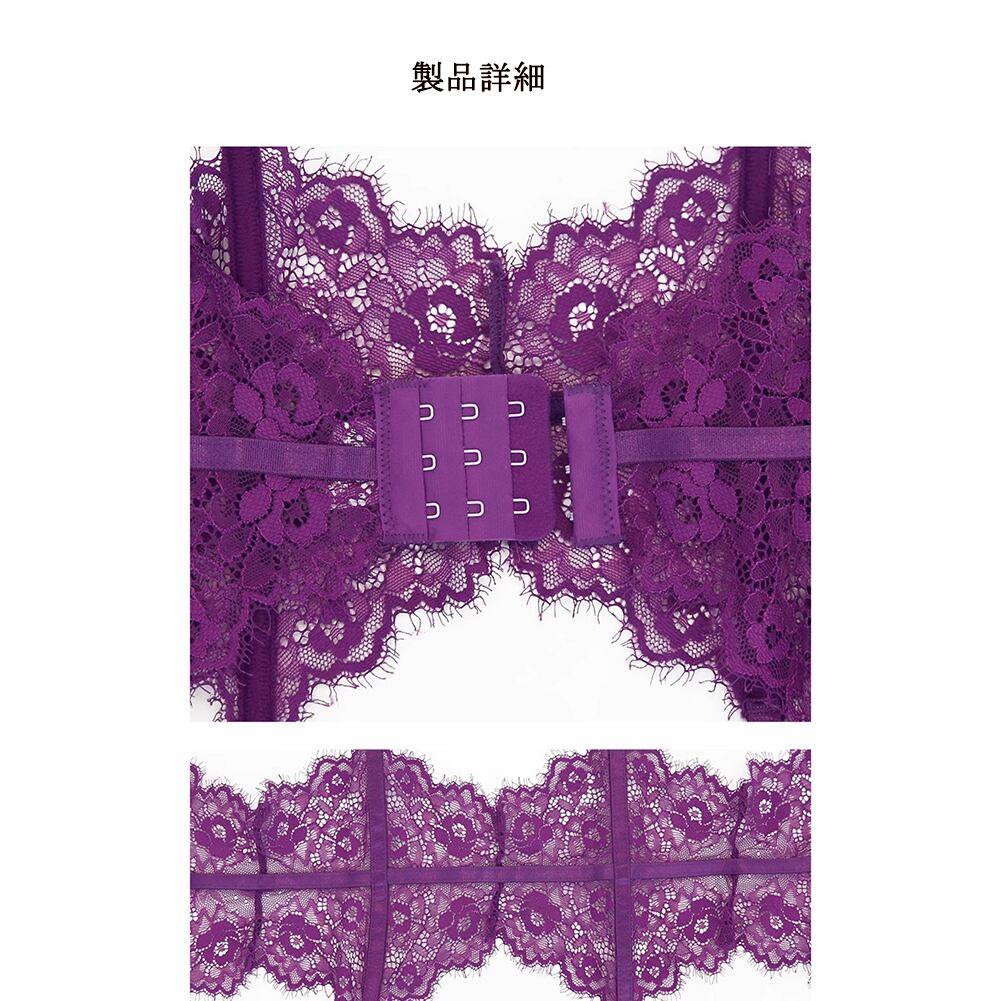 SENMHS ガーターランジェリー [トップス・ハングネックバンド・ショーツ・ガーター・手袋] 5点セット セクシー レース フェミニンなベビードール ガーターベルト エッチ な エロ 誘惑 調教 可愛い 透け透け デザイン パープル レディース ワンサイズ3385