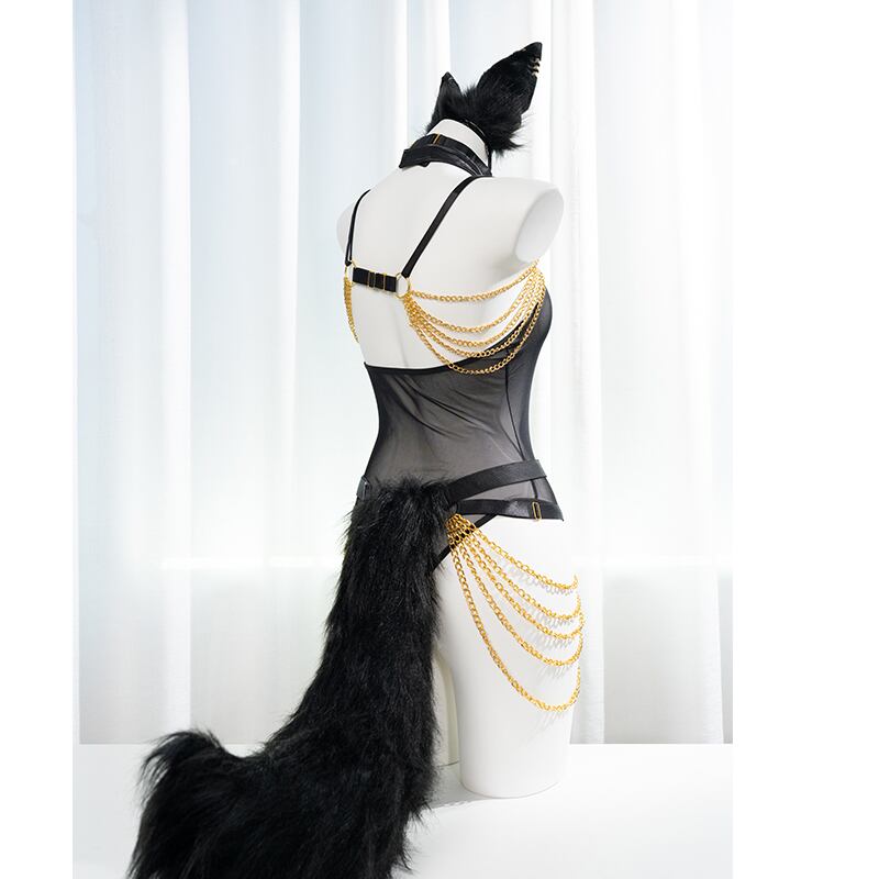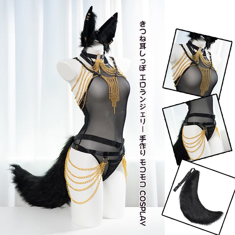 セット内容: 尻尾+狐耳+トップス+下着+シースルーレオタード(5点セット)