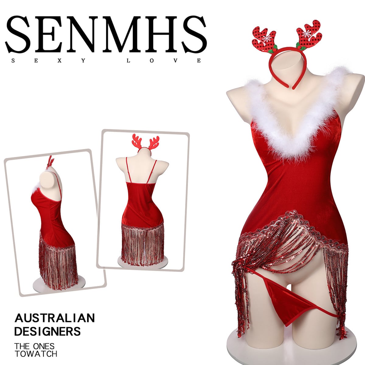 SENMHS クリスマス サンタ コスプレ セクシー セクシー鹿コス 可愛い トナカイ 過激 エッチ ドレス ベビドール サンタコス 衣装 サンタクロース 仮装 コスチューム イベント パーティー 舞台 ワンピース 鹿カチューシャ7521