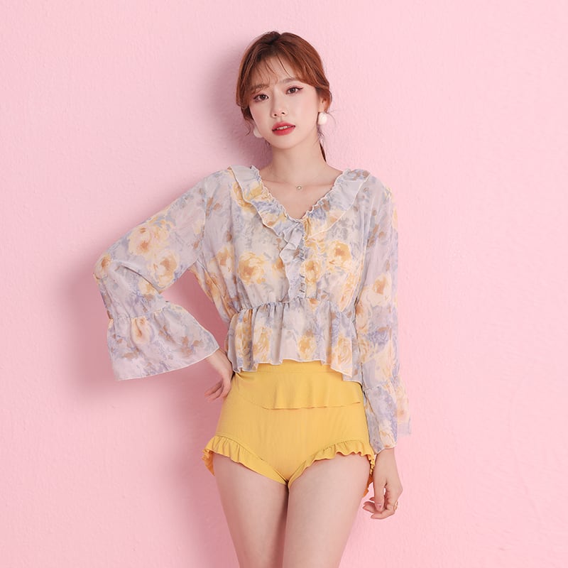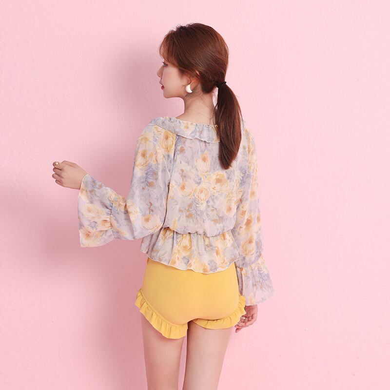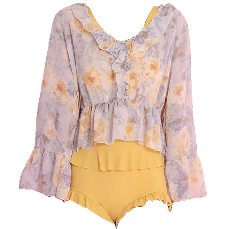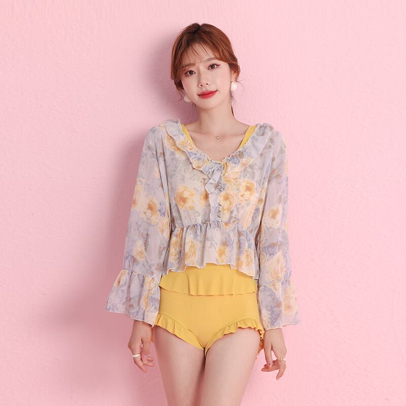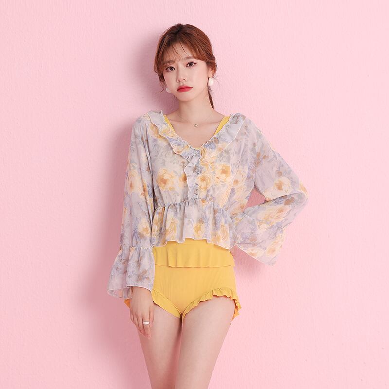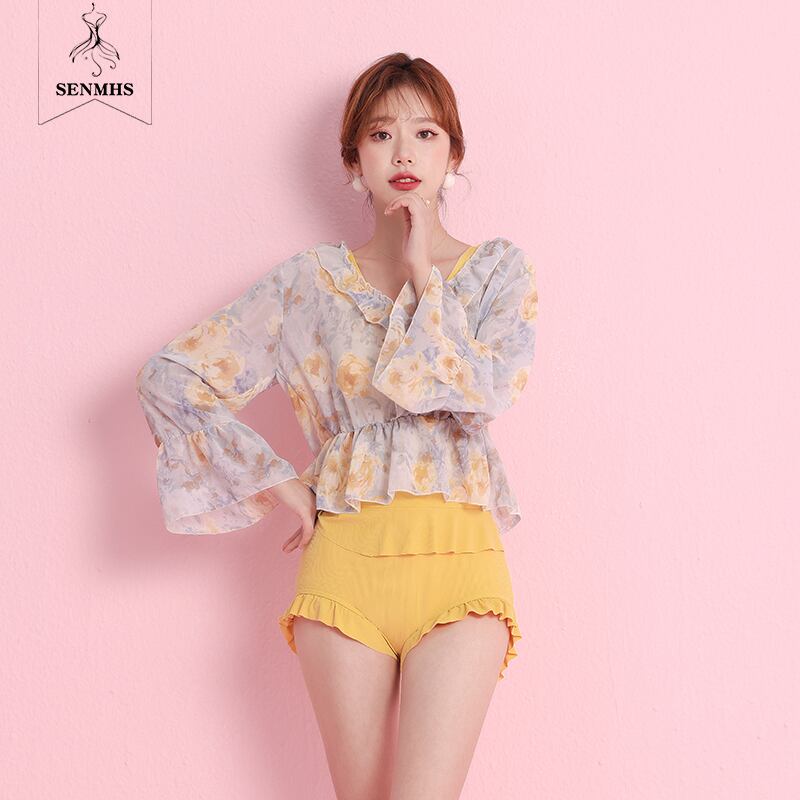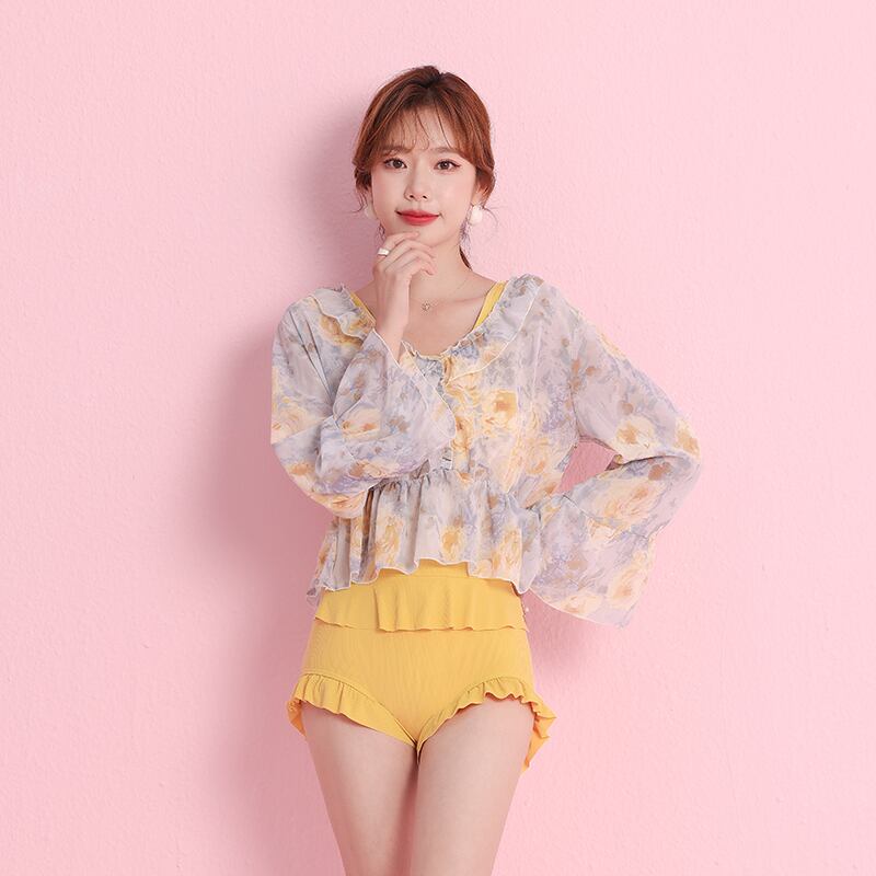 SENMHS 水着 レディース 体型カバー フィットネス水着 かわいい おしゃれ オールインワン ラッシュガード エレガント 露出控えめ ノンワイヤー ミニスカート 長袖 2点セット 20代 30代40代 ママ水着 海 温泉 旅行 イエロー2867